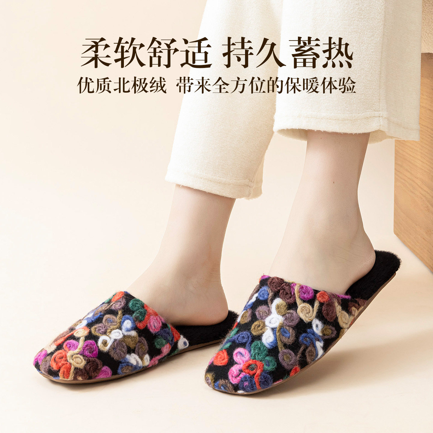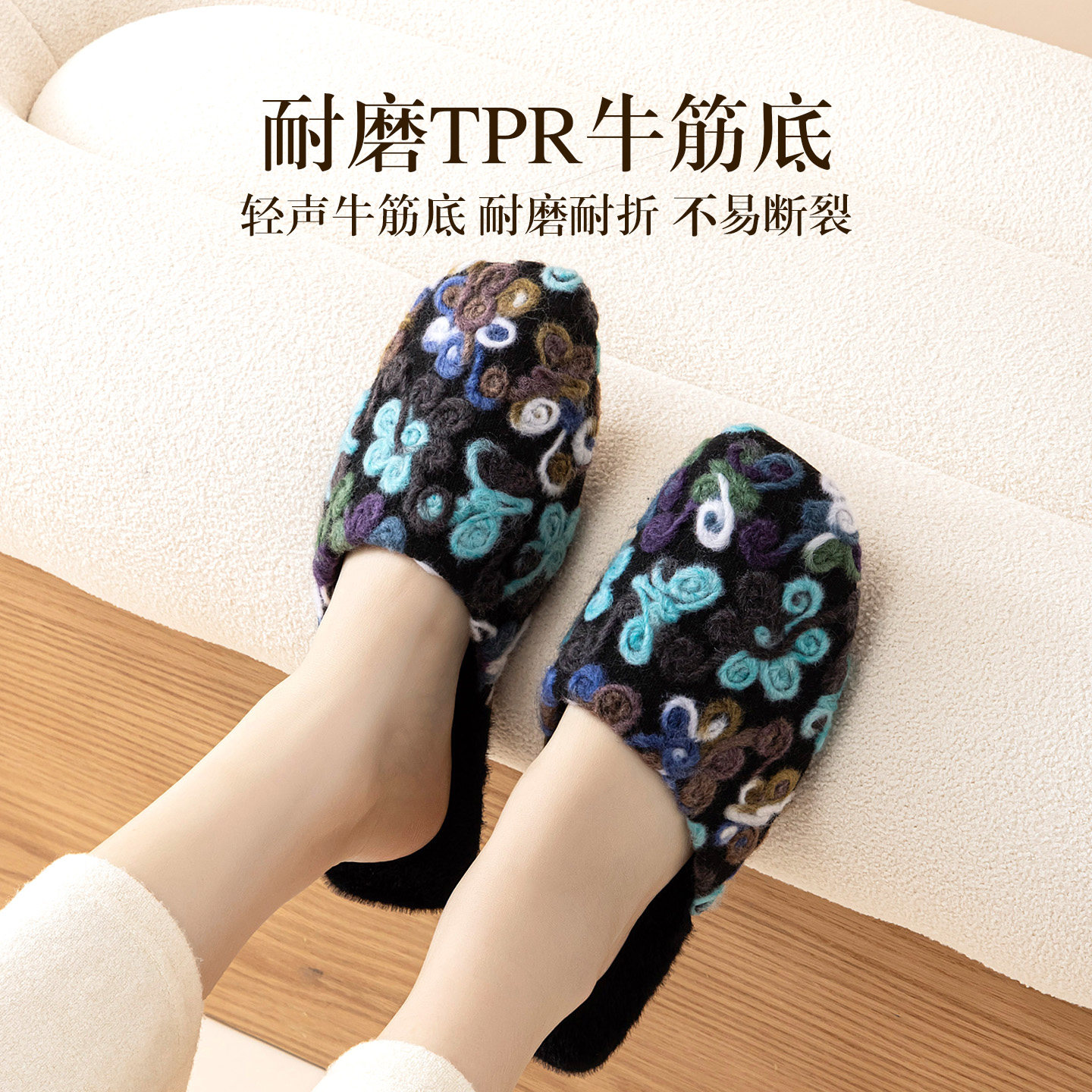 复古精致工艺手工盘花毛线花棉拖鞋女秋冬季居家用牛筋底保暖拖鞋