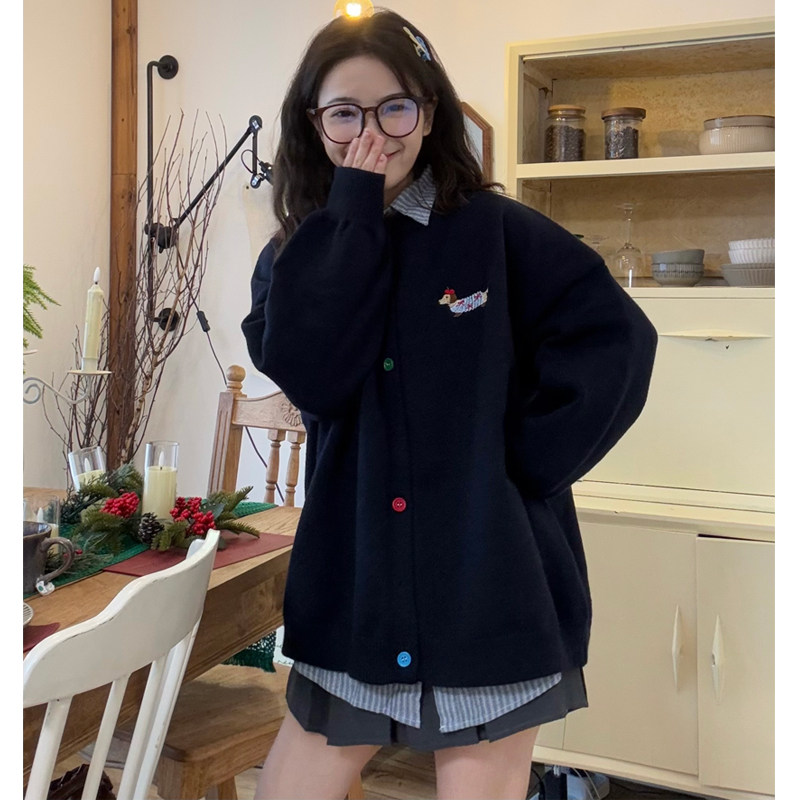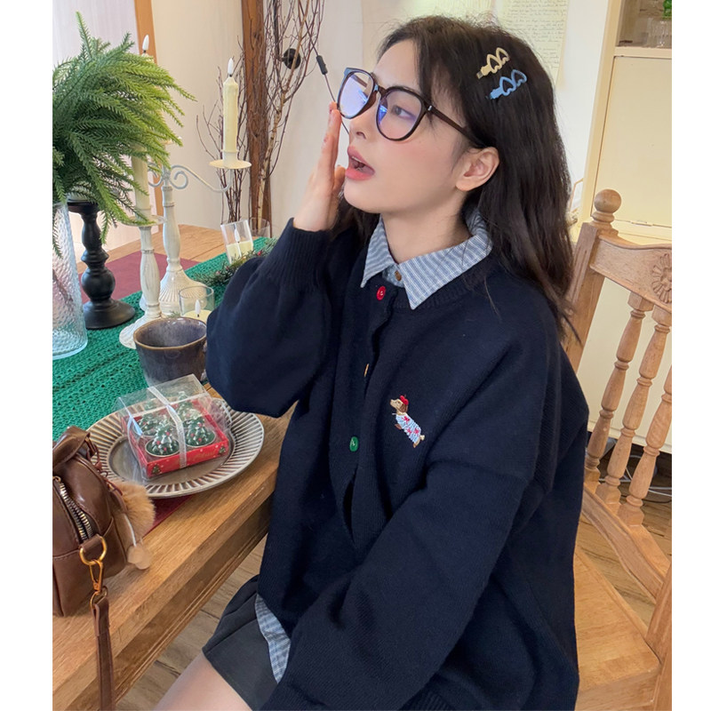 条纹衬衫+彩色纽扣开衫针织毛衣