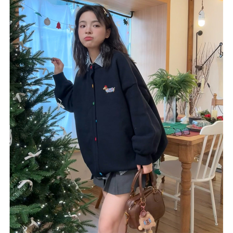 大码女装胖mm学院风翻领条纹衬衫彩色纽扣开衫针织毛衣外套两件套