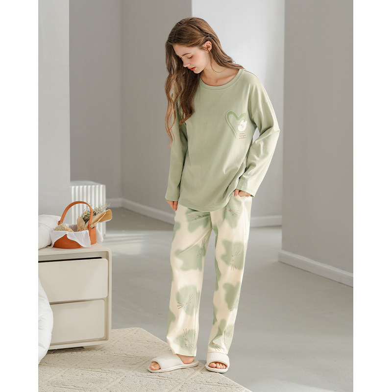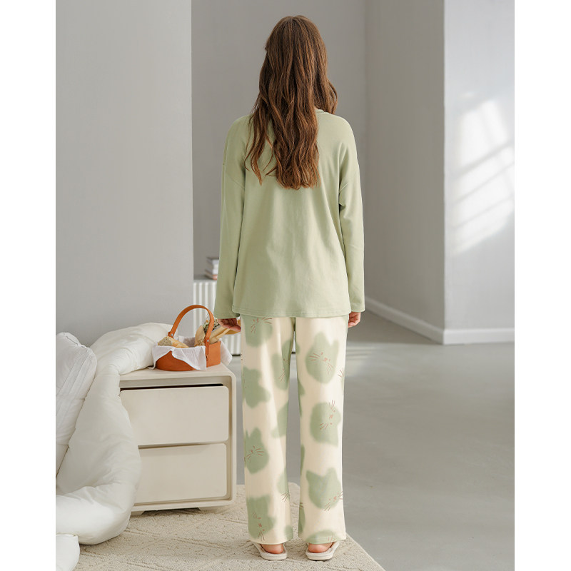 芬腾纯棉春秋季女士睡衣长袖套头套装可爱宽松休闲大码全棉家居服