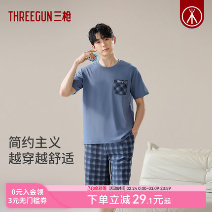 三枪夏季纯棉睡衣男短袖短裤条纹格子印花宽松休闲可外穿男家居服