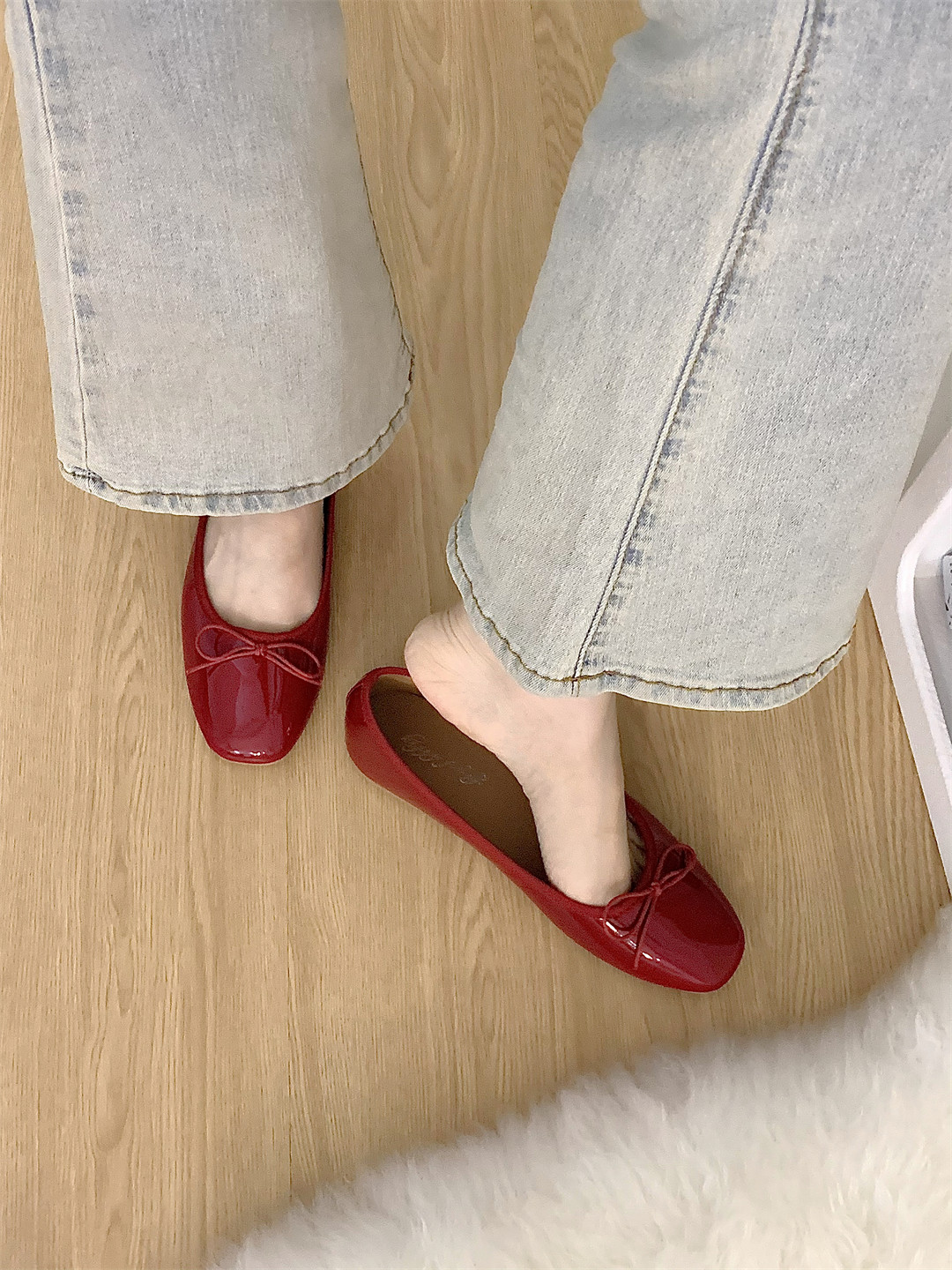 小红鞋女秋韩版ins蝴蝶结平底平跟单鞋女圆头浅口温柔瓢鞋奶奶鞋
