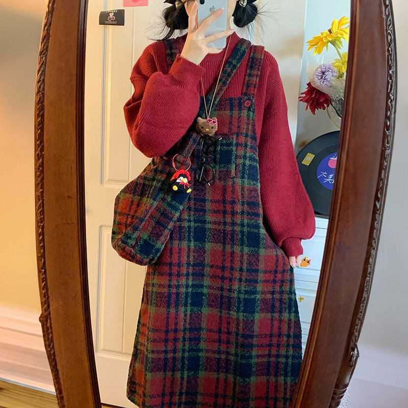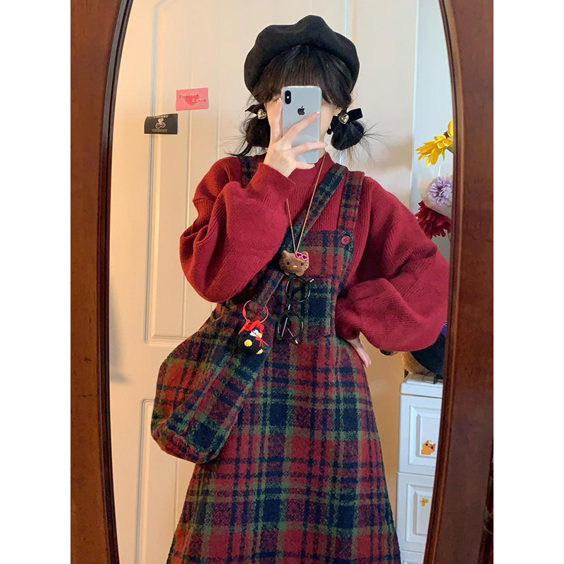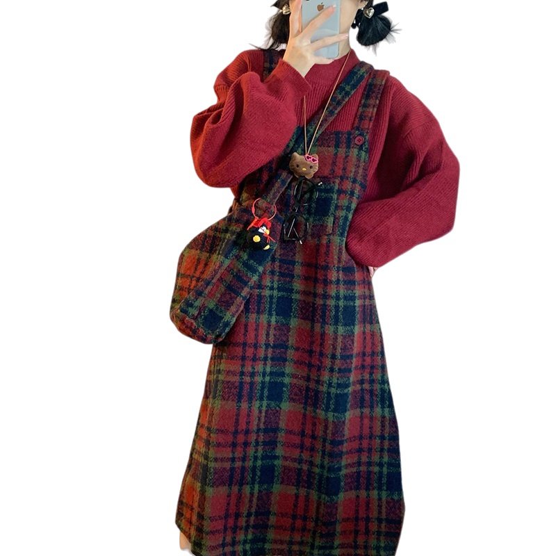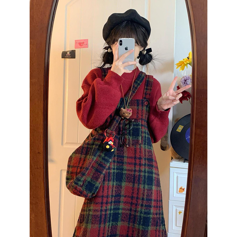 学院风复古格子背带毛呢连衣裙子女学生+显瘦红色针织衫两件_套装