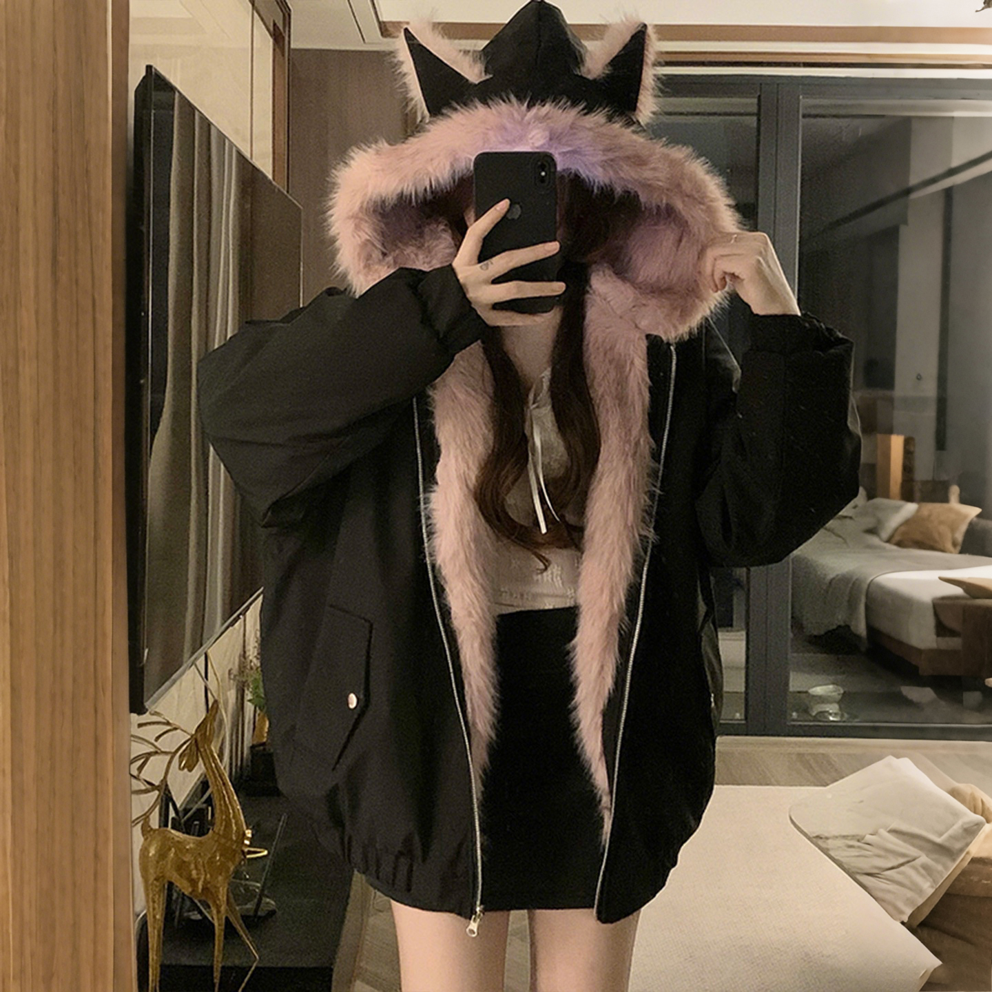 特大码女装胖mm连帽双面穿棉服外套女冬季宽松显瘦加厚保暖棉衣潮