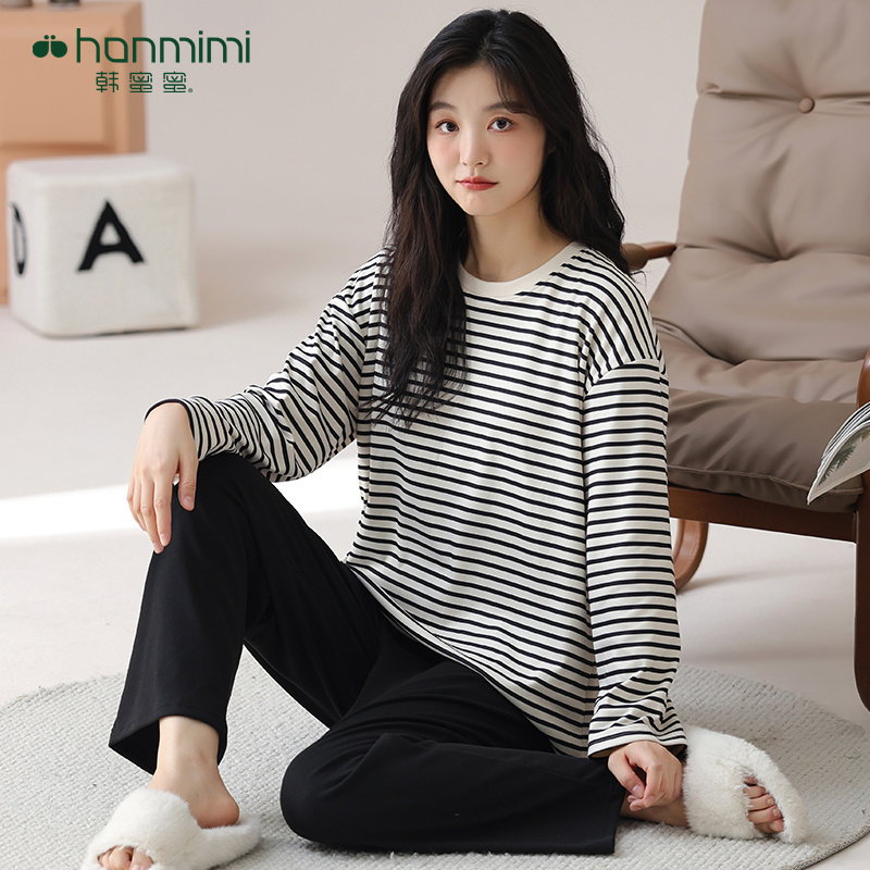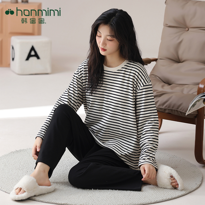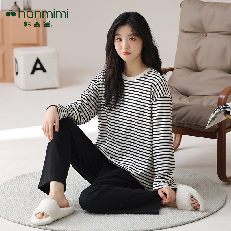 韩蜜蜜条纹睡衣女德绒圆领德绒长袖长裤休闲可外穿家居服秋冬季