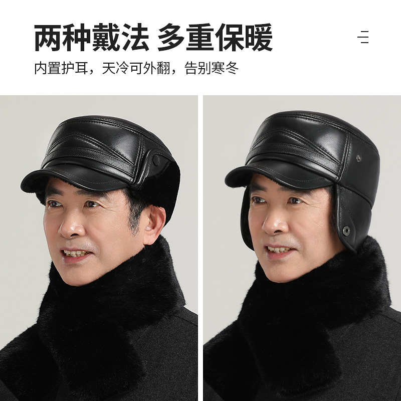 恒源祥中老年人男士冬季帽子爸爸爷爷牛皮保暖雷锋平顶鸭舌真皮帽