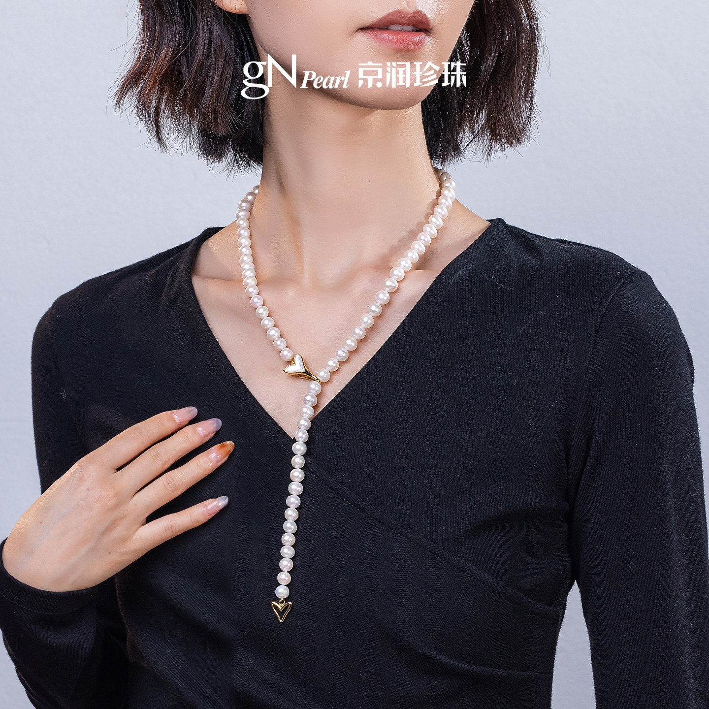 京润珍珠岁宛925银淡水珍珠毛衣Y字链7.3-8.3mm白色近圆全珠项链D