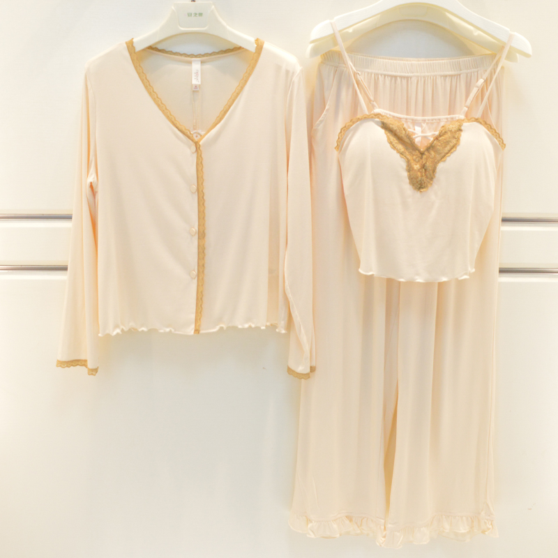 妮可雅睡衣秋季女士优可丝舒弹罗纹三件套带胸垫性感长袖家居服