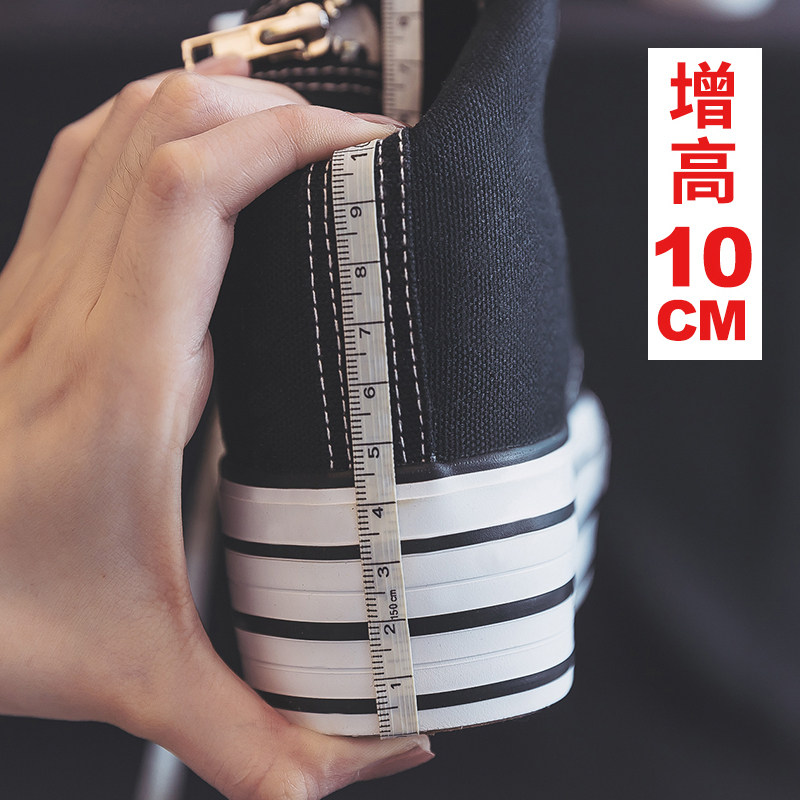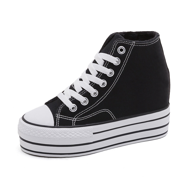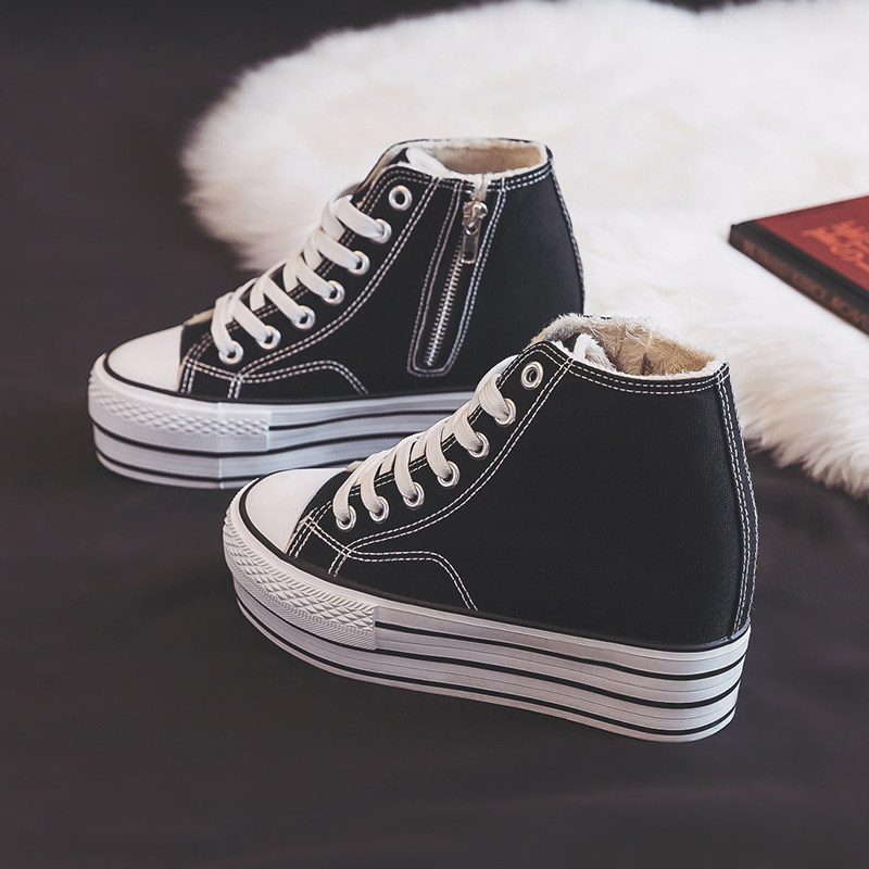 秋冬新款帆布鞋女厚底内增高10cm高帮鞋拉链加绒棉鞋保暖黑色板鞋