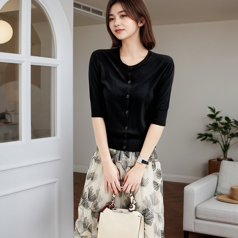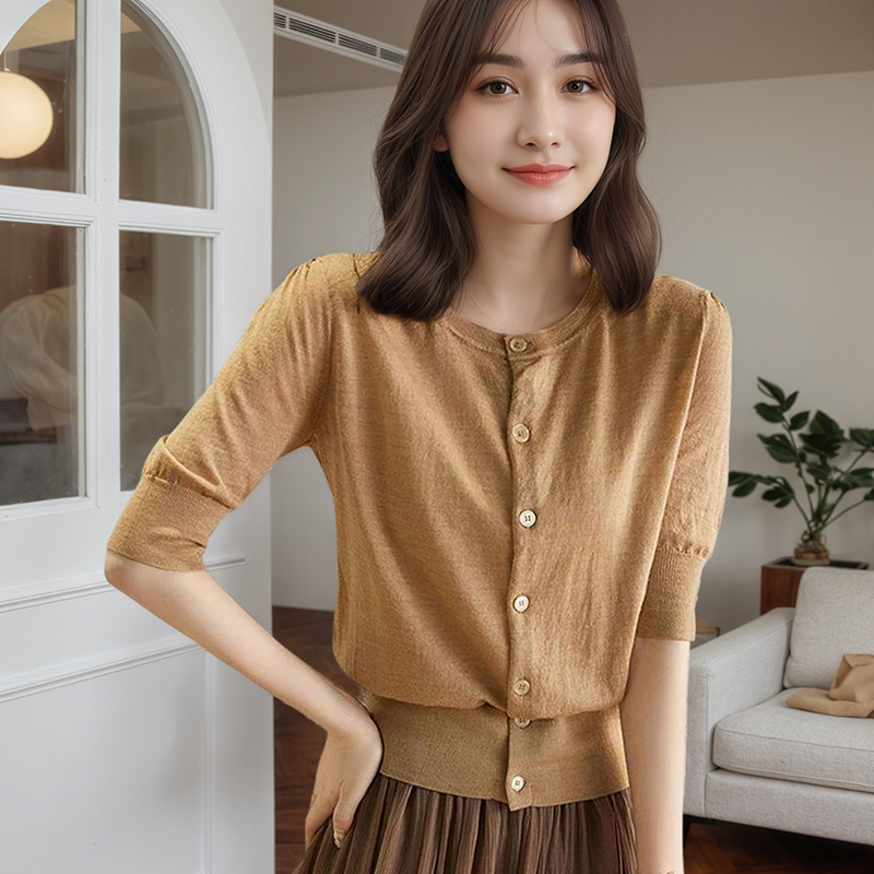 蓝色泡泡袖针织开衫外套女夏季新款高级感收腰显瘦小香风短款上衣