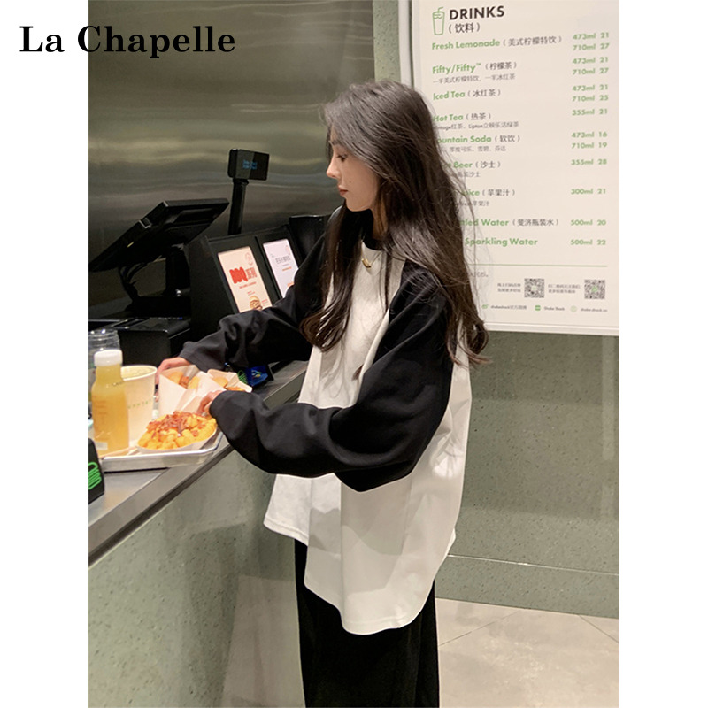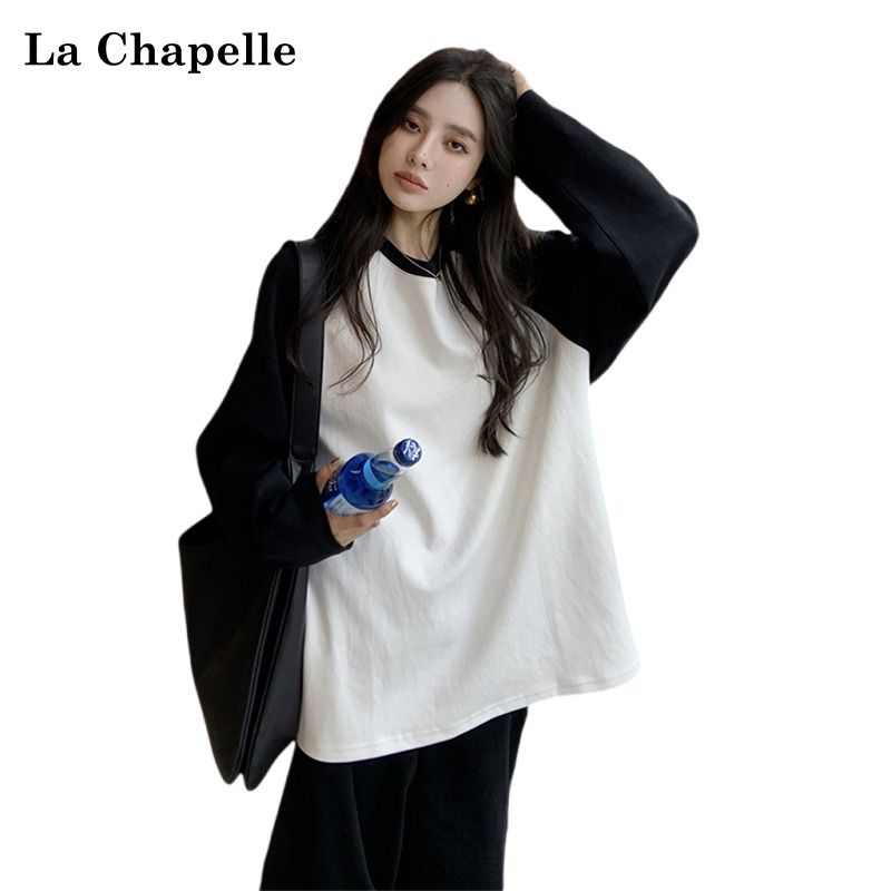 拉夏贝尔圆领纯棉打底衫女秋冬中长款卫衣遮屁股配鲨鱼裤的上衣