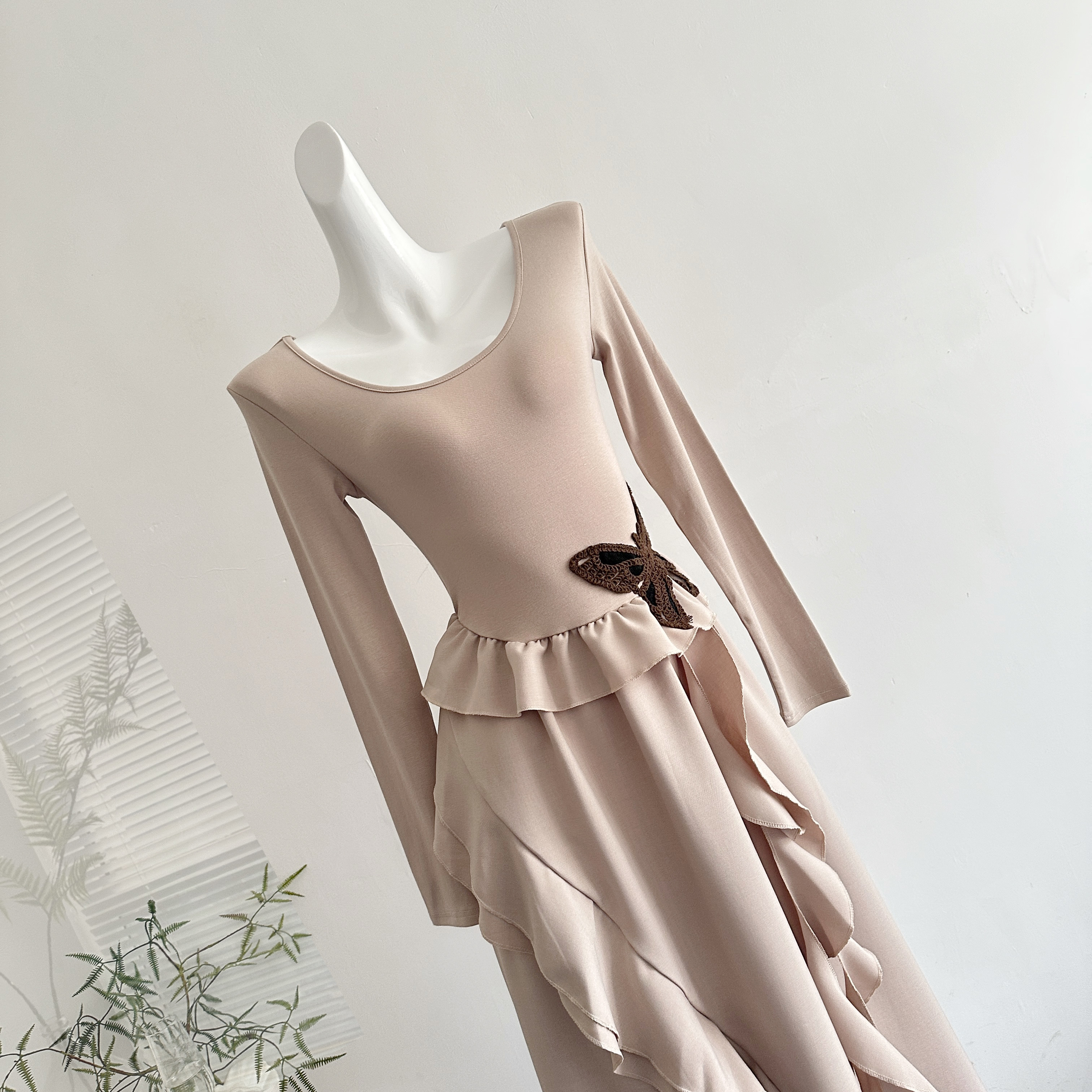 松本丧丧2025秋装新款长袖不规则蝴蝶长裙早秋穿搭弹力掐腰连衣裙