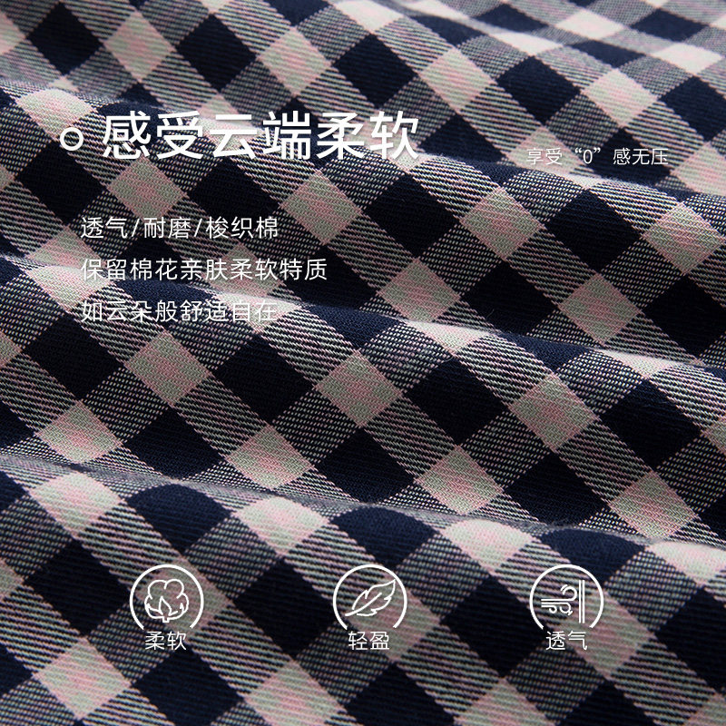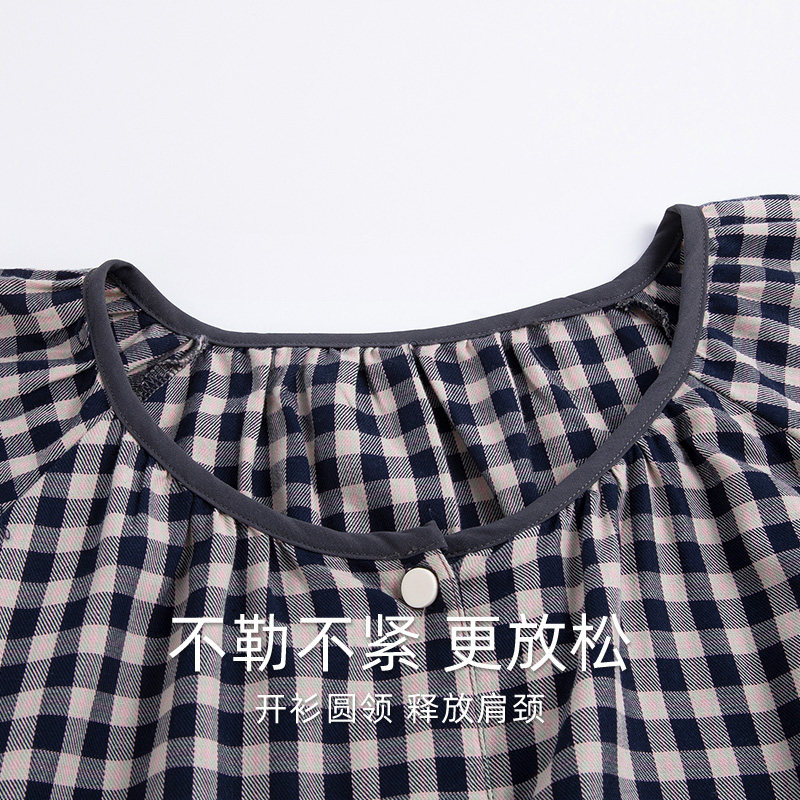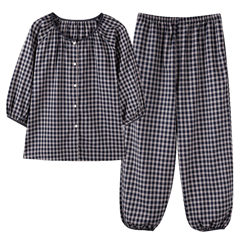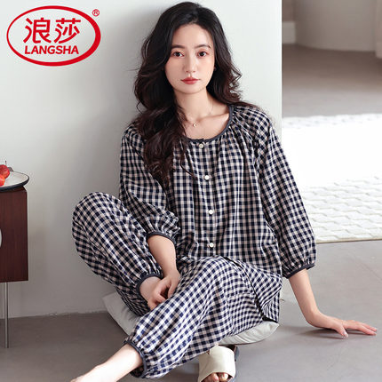 浪莎梭织纯棉棉纱布睡衣女春夏季薄款格子家居服妈妈大码半袖套装