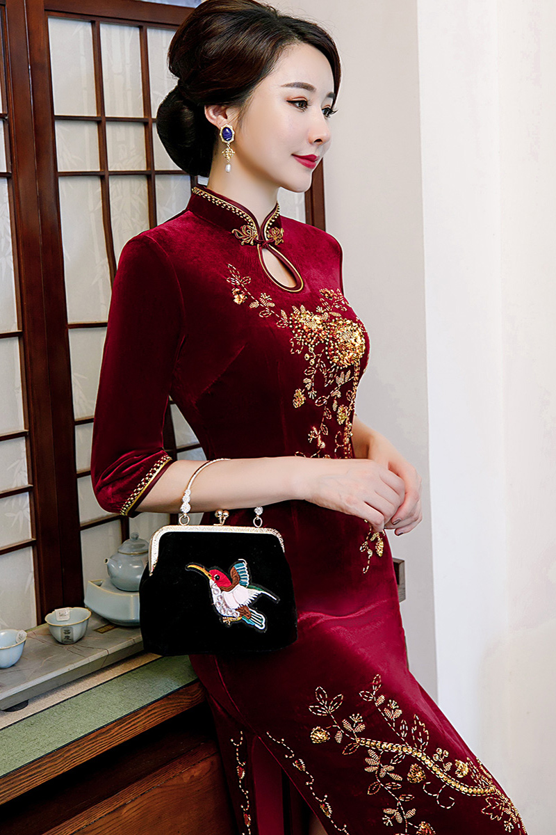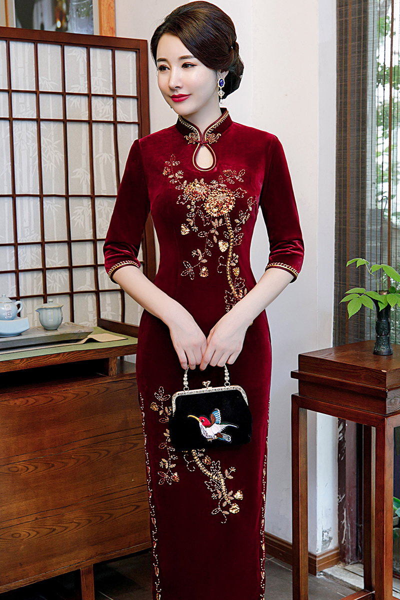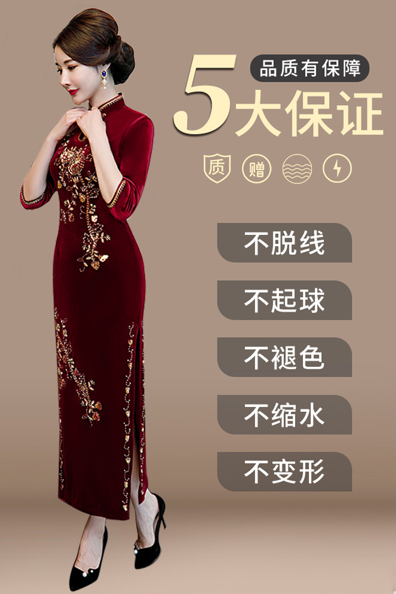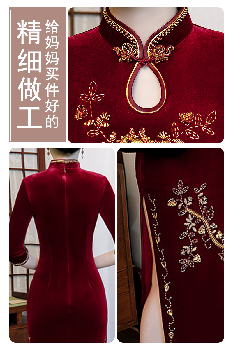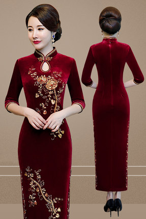 高贵洋气新款旗袍结婚春秋妈妈走秀婚宴金丝绒高级礼服秋冬长袖
