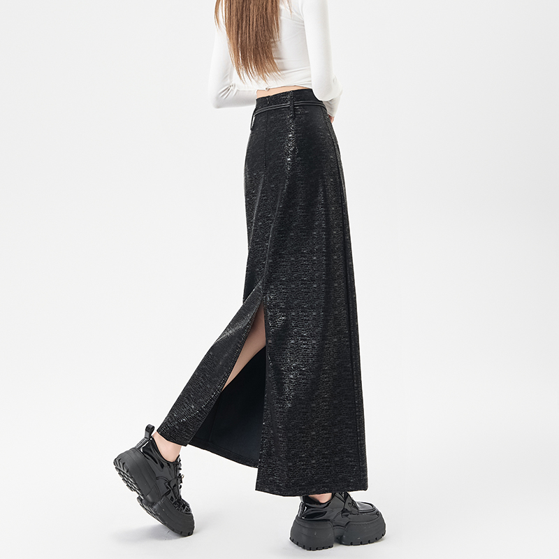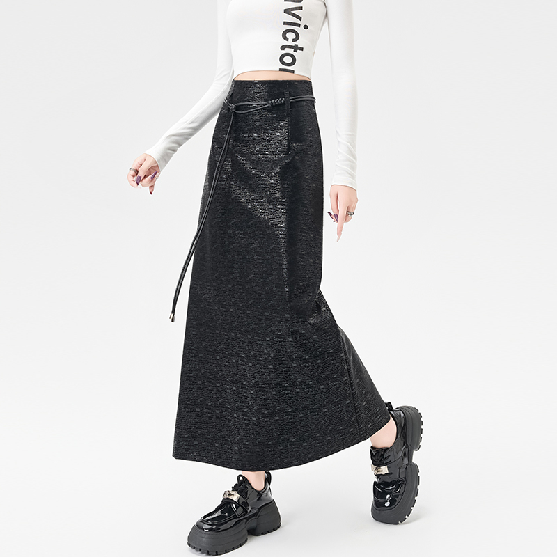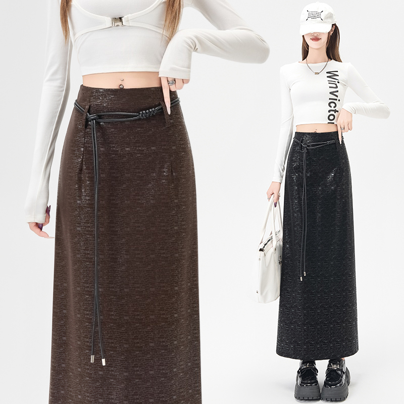 实拍半身裙女秋季设计感高腰系带a字时尚气质后开叉包臀直筒裙子