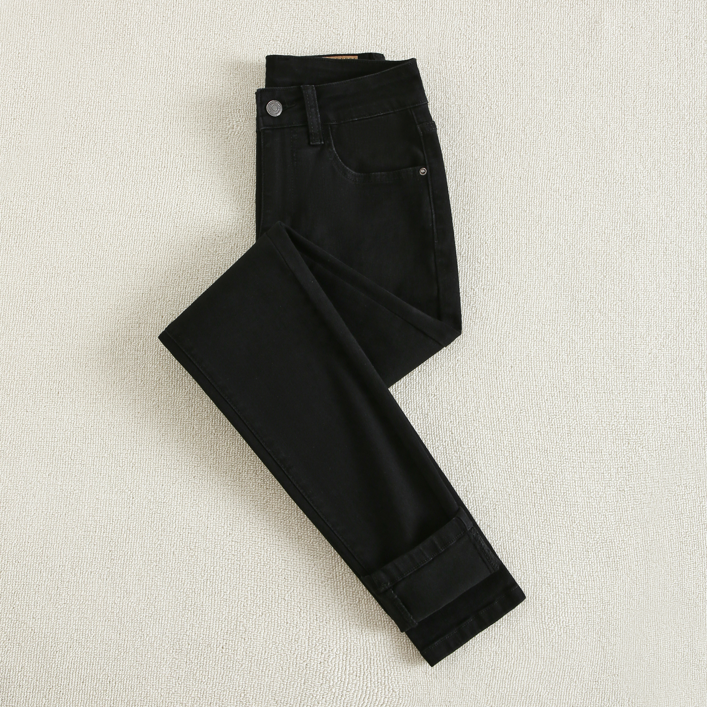 拉夏贝尔加绒高腰紧身小脚牛仔裤女2025秋季修身显瘦黑色铅笔裤子