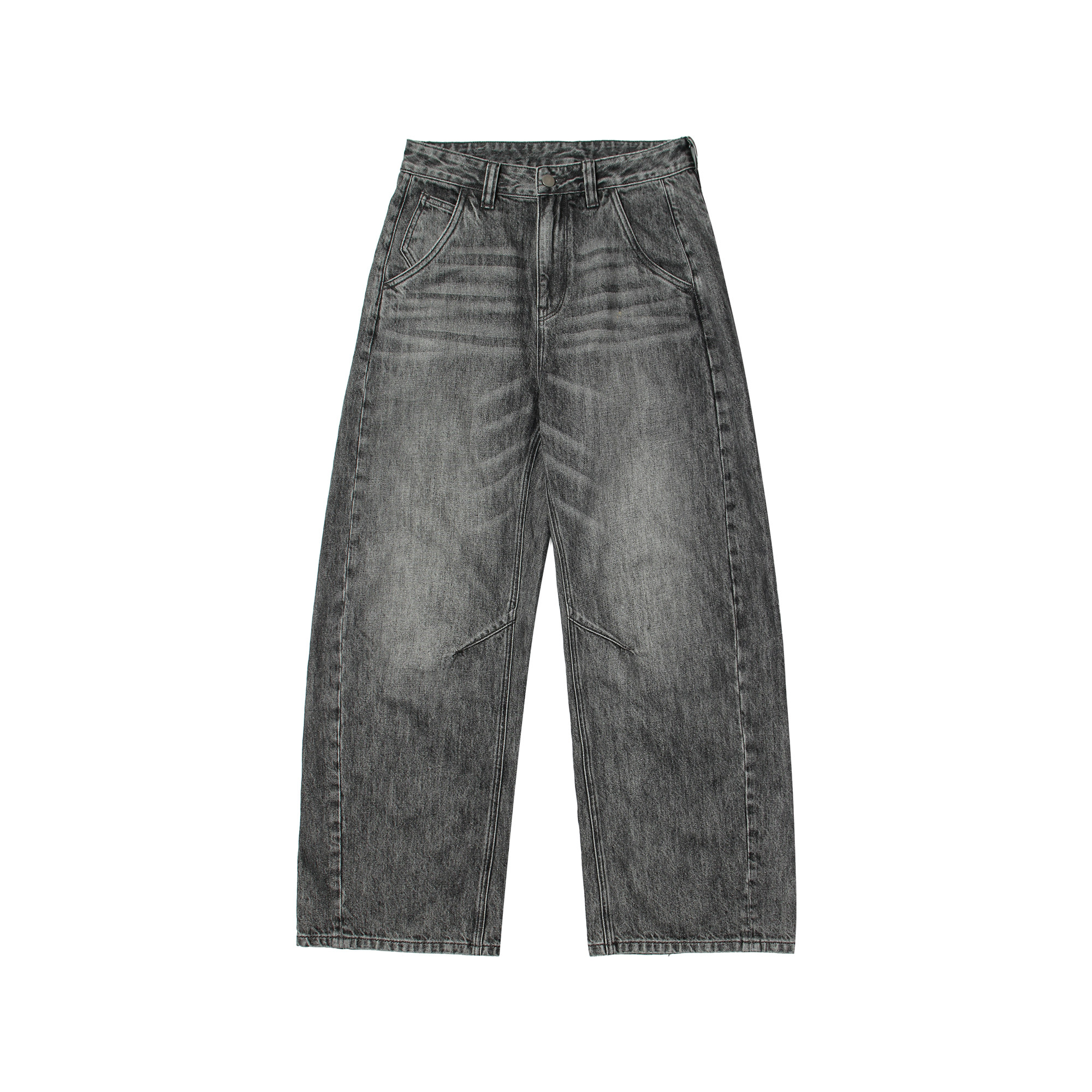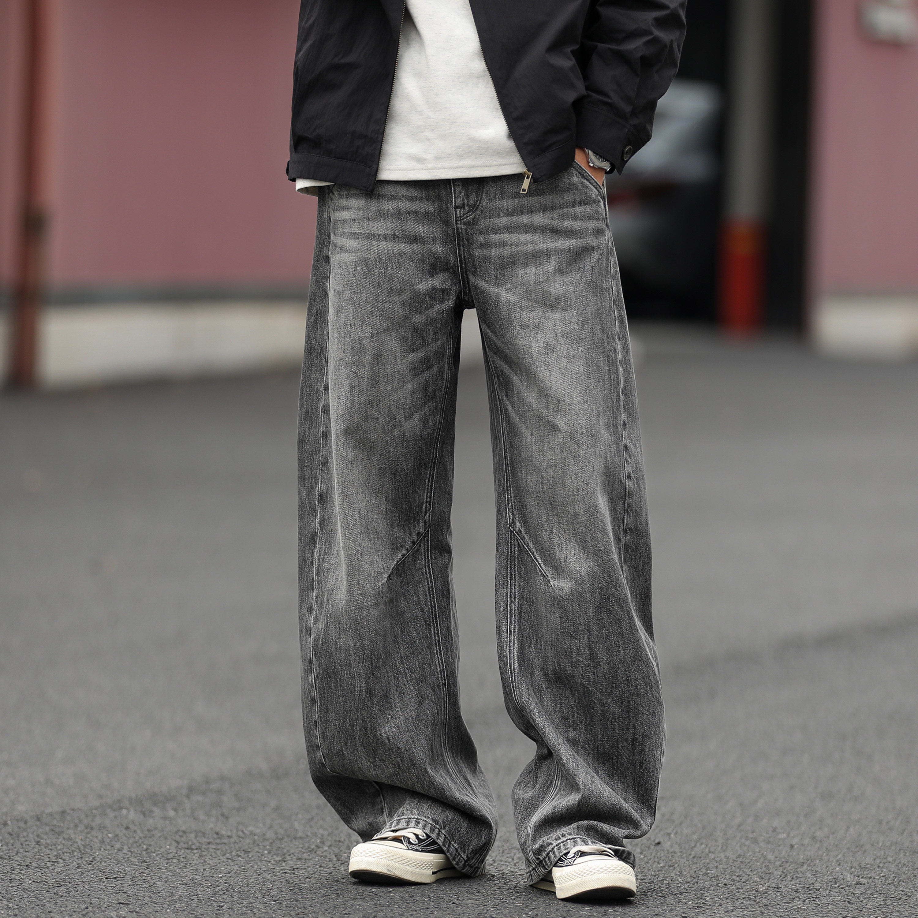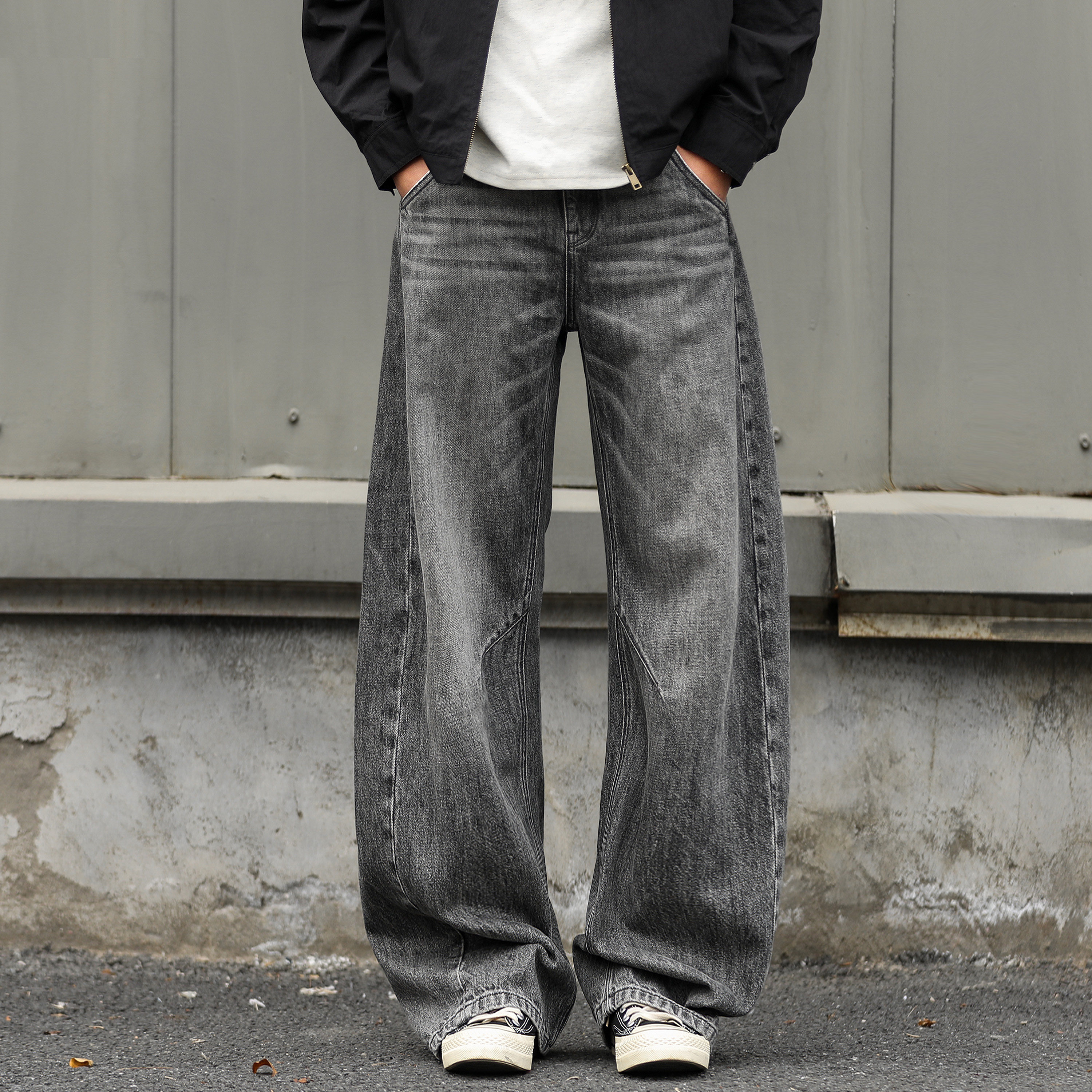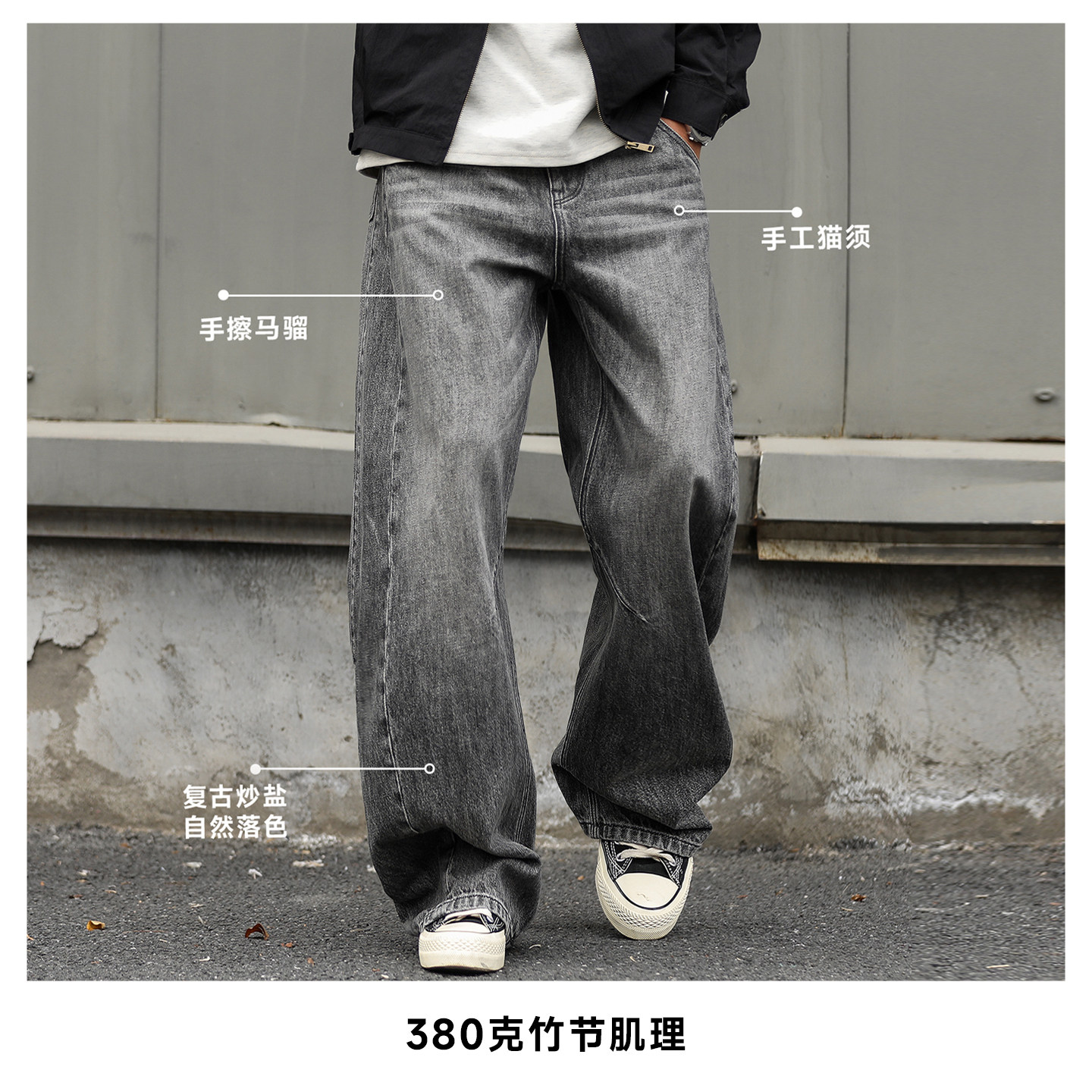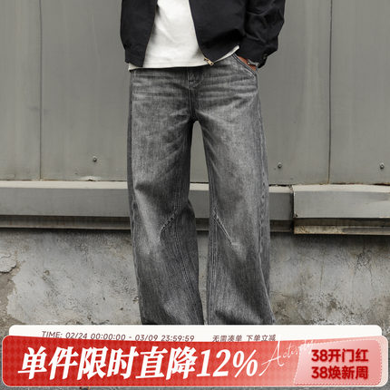 嘿马七作美式复古春季水洗做旧弯刀牛仔裤男士宽松休闲裤阔腿长裤