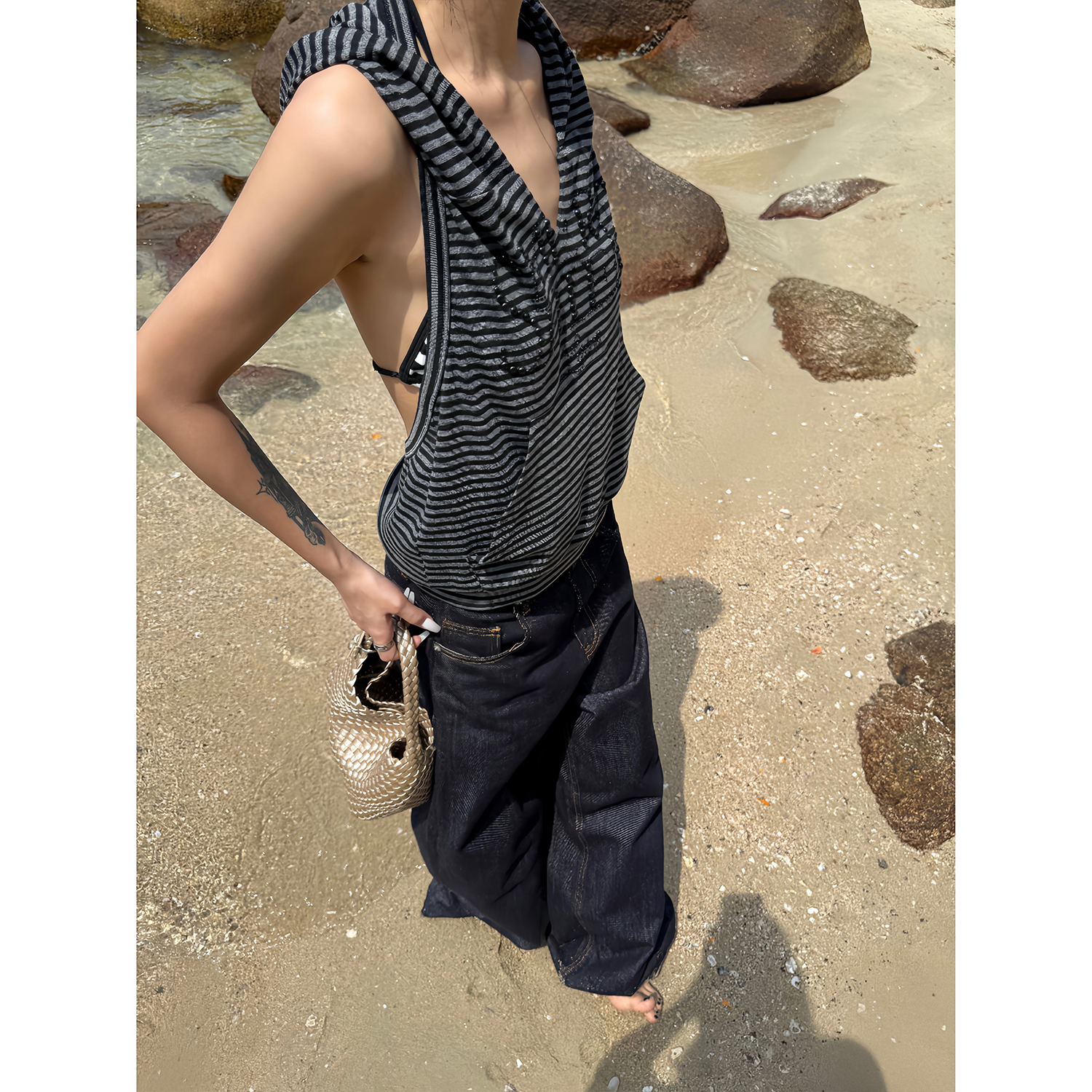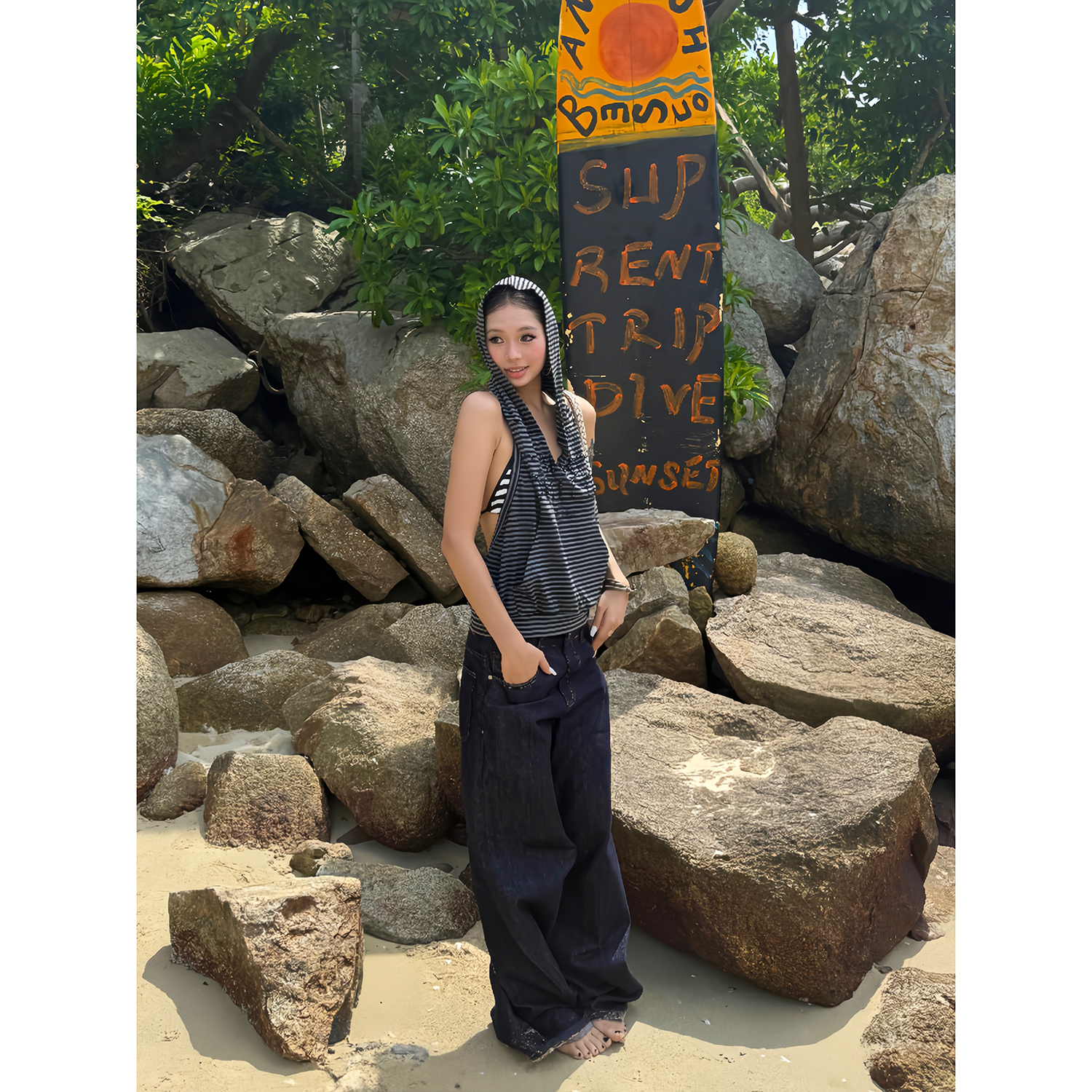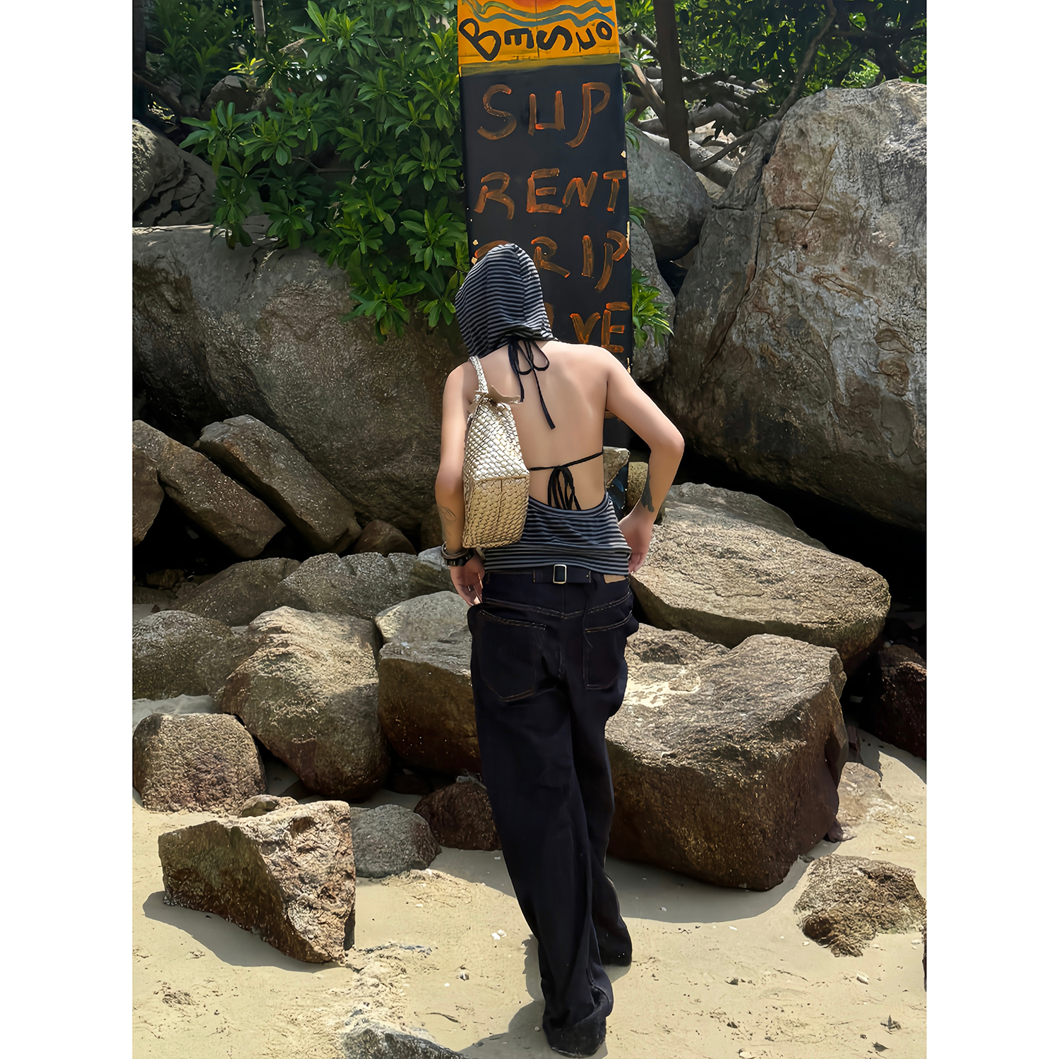 F383 美式复古条纹半露背连帽短袖T恤休闲凉快小众背心女辣妹款夏