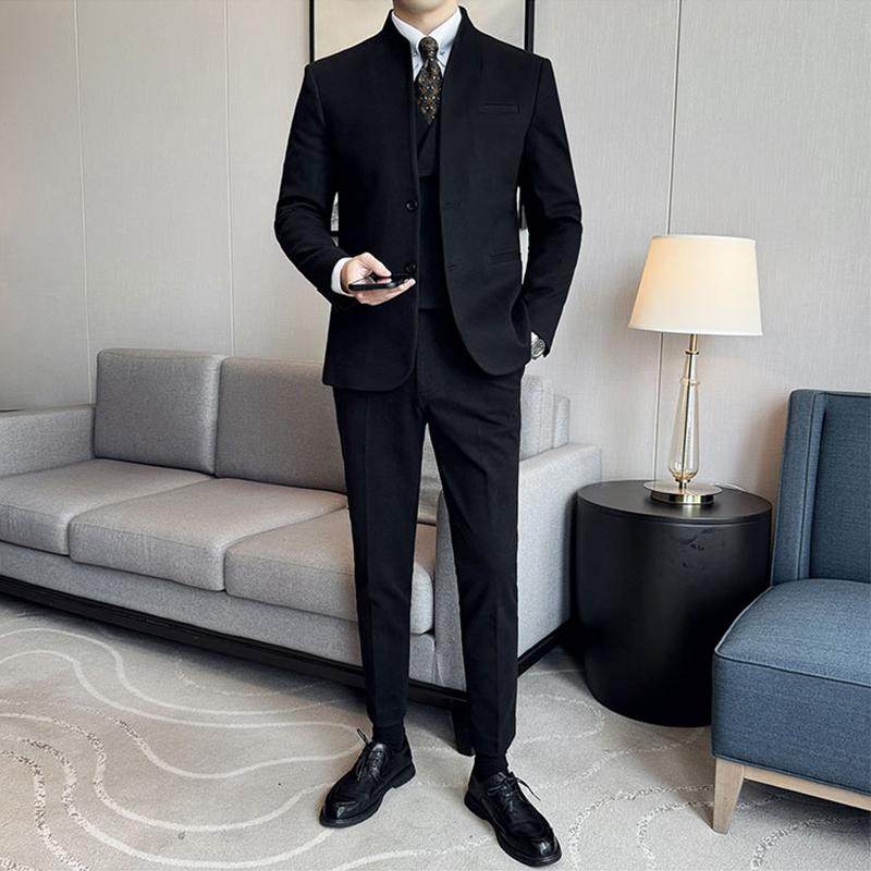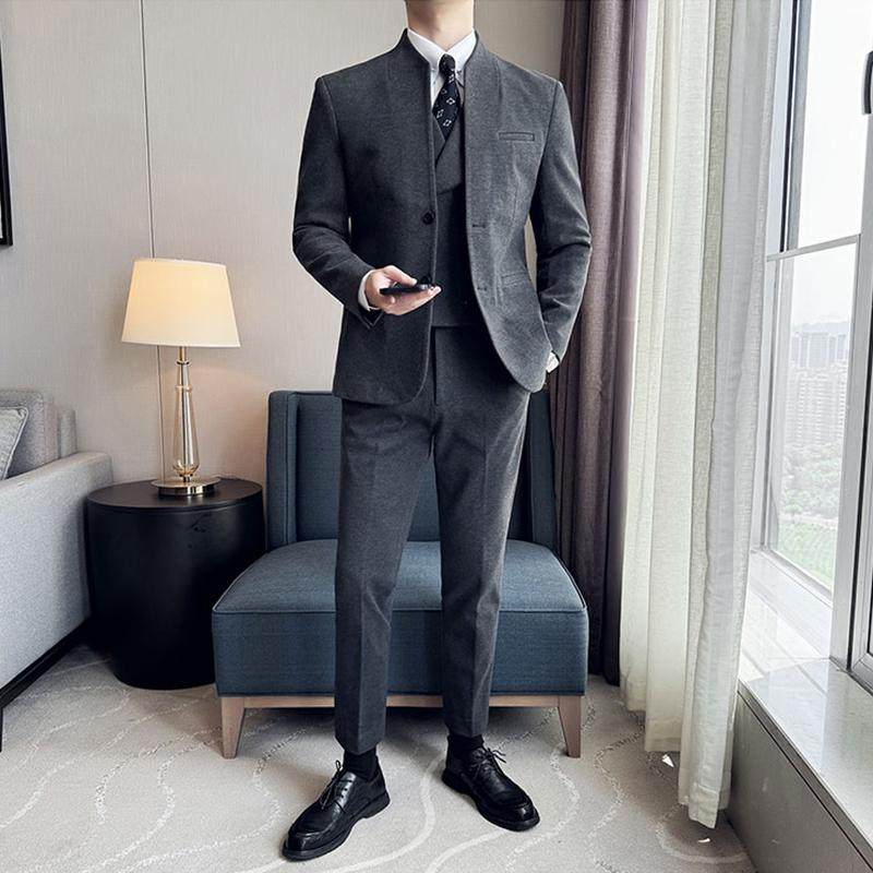 冬季加厚立领毛呢外套男新中式保暖西装商务通勤西服新郎礼服套装