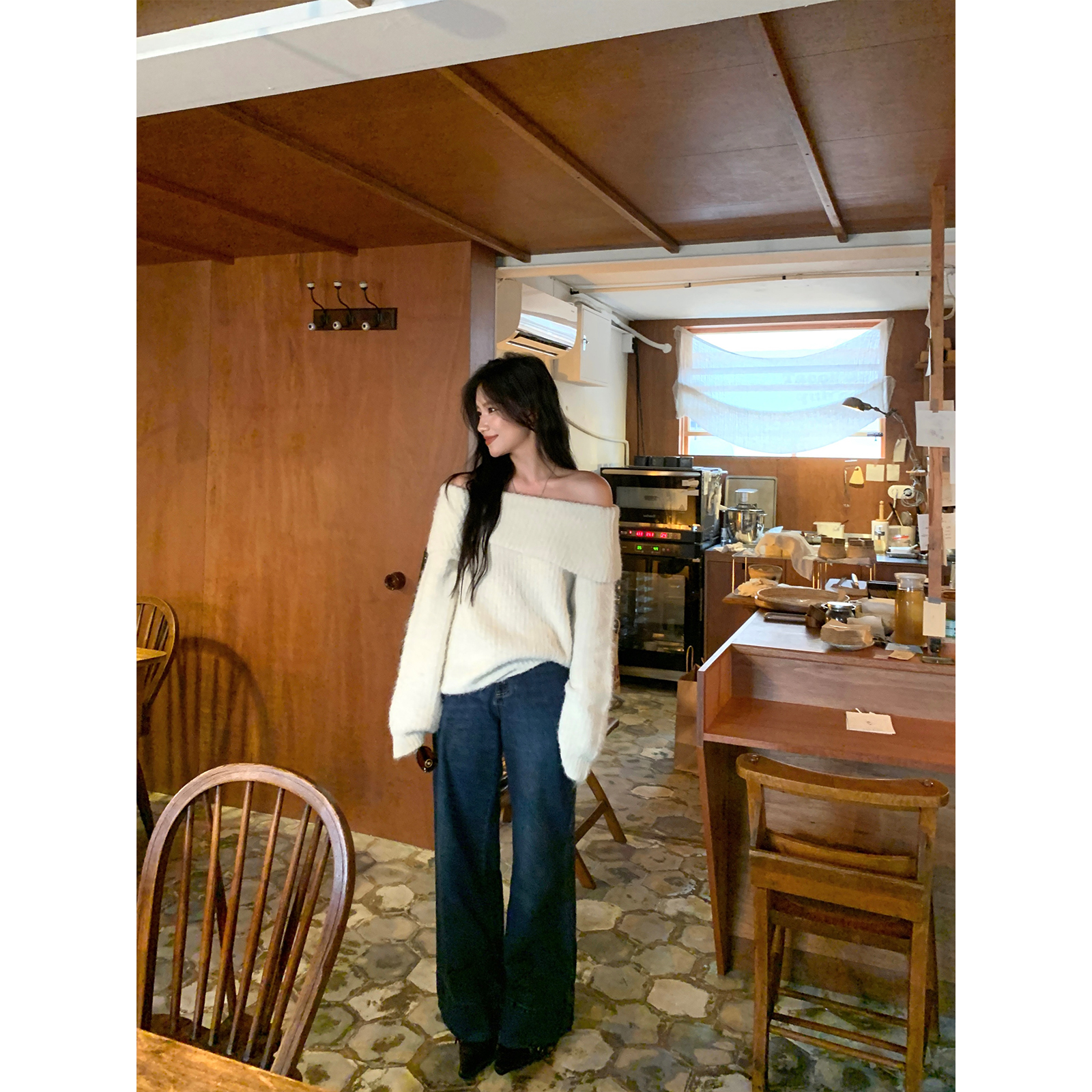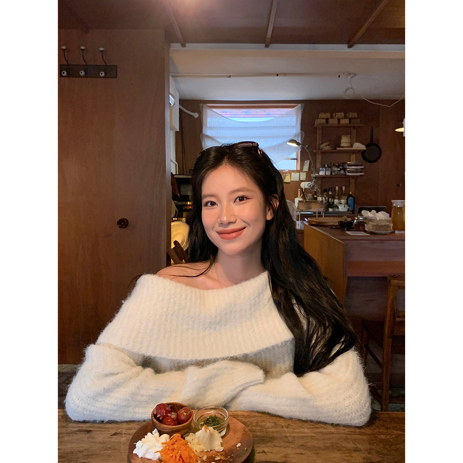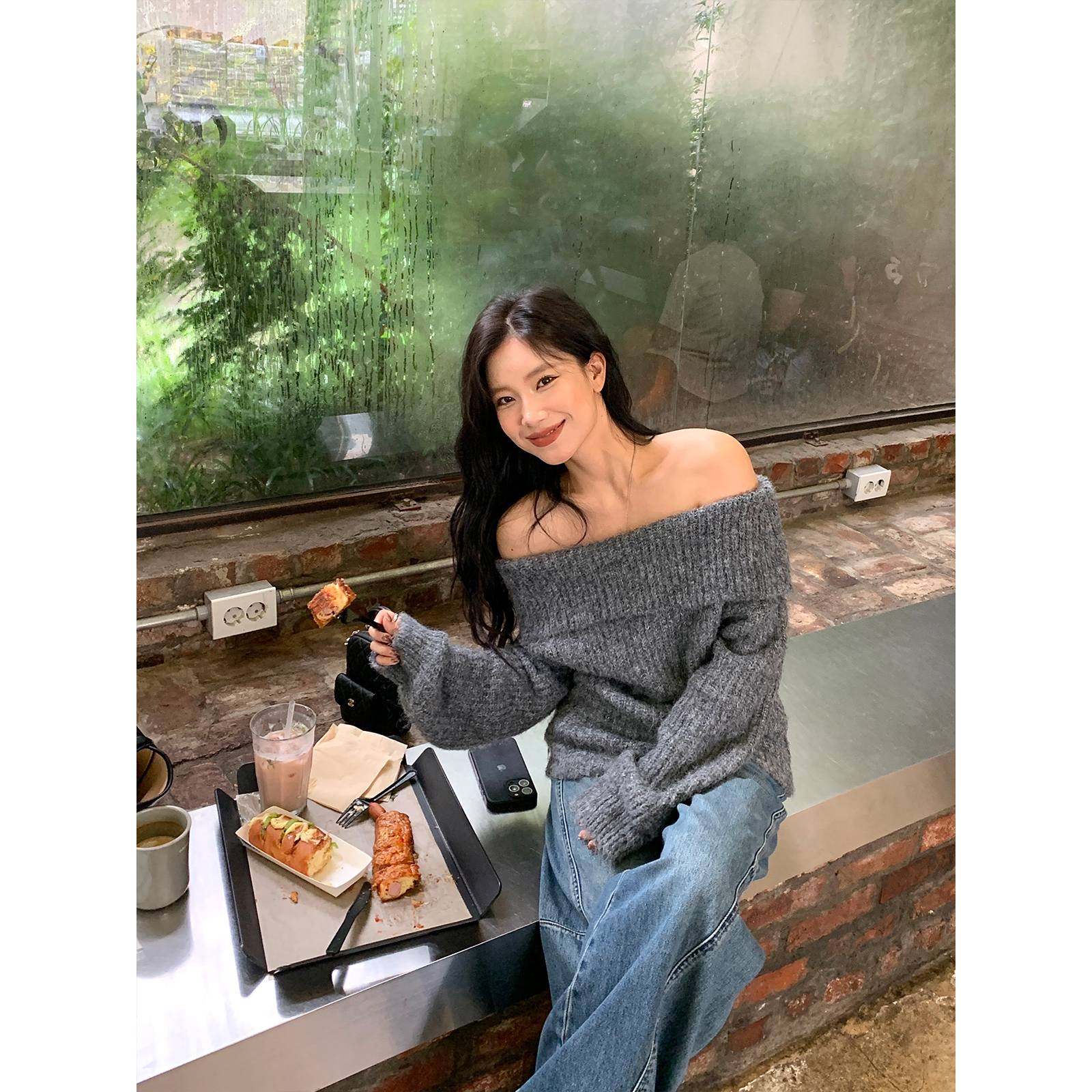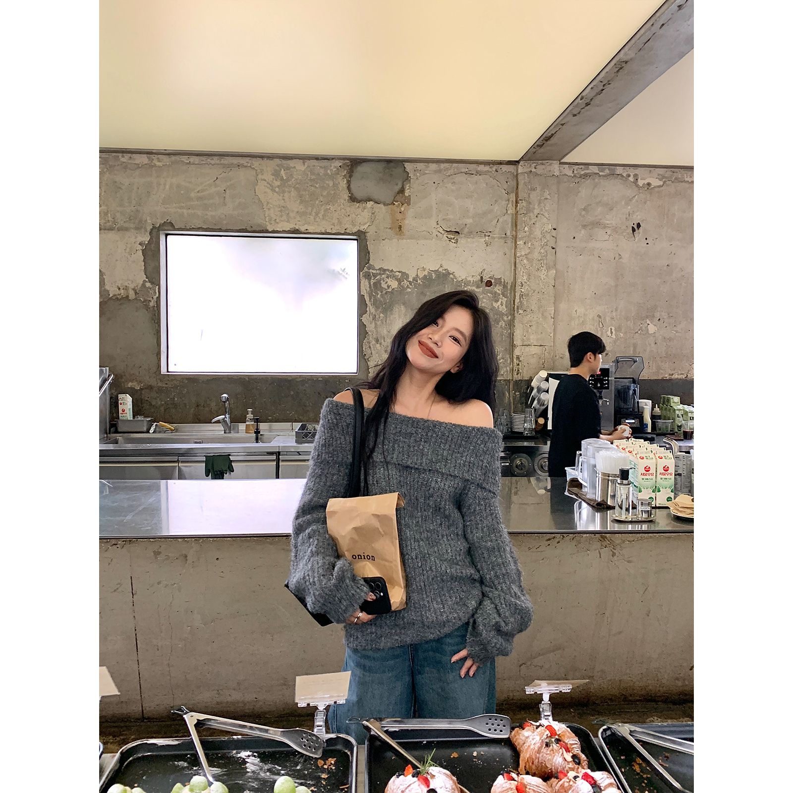 鄭大钱 一字领斜肩毛衣2024新款秋冬宽松显瘦慵懒风高级感外套女