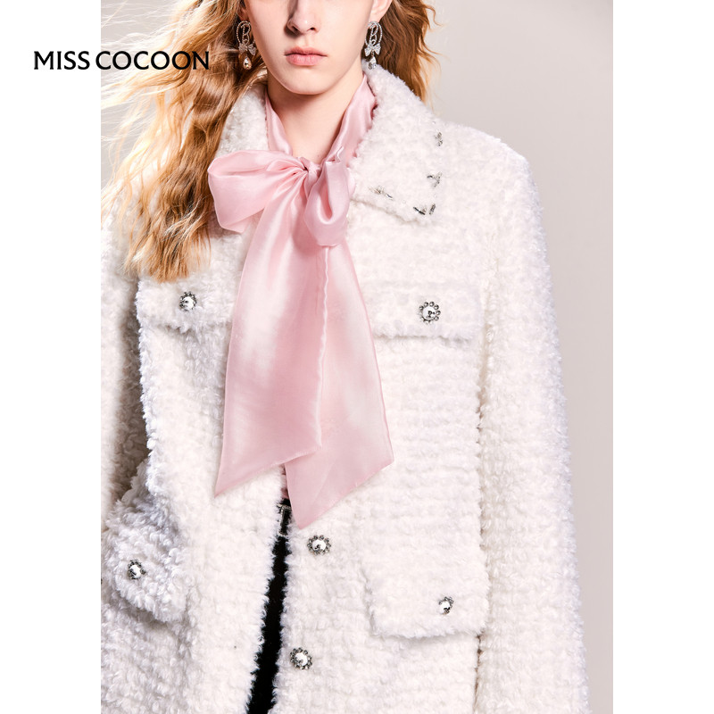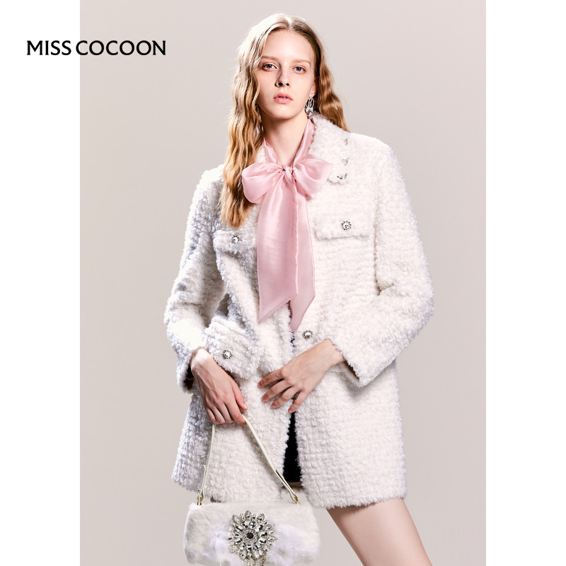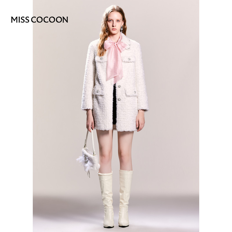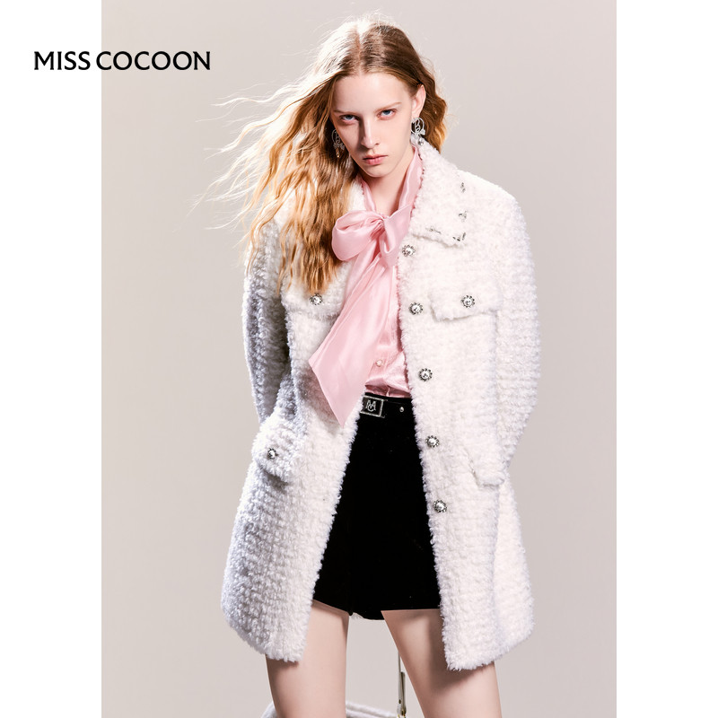 MISSCOCOON翻领钻饰白色香风羊毛皮草外套保暖大衣秋冬款