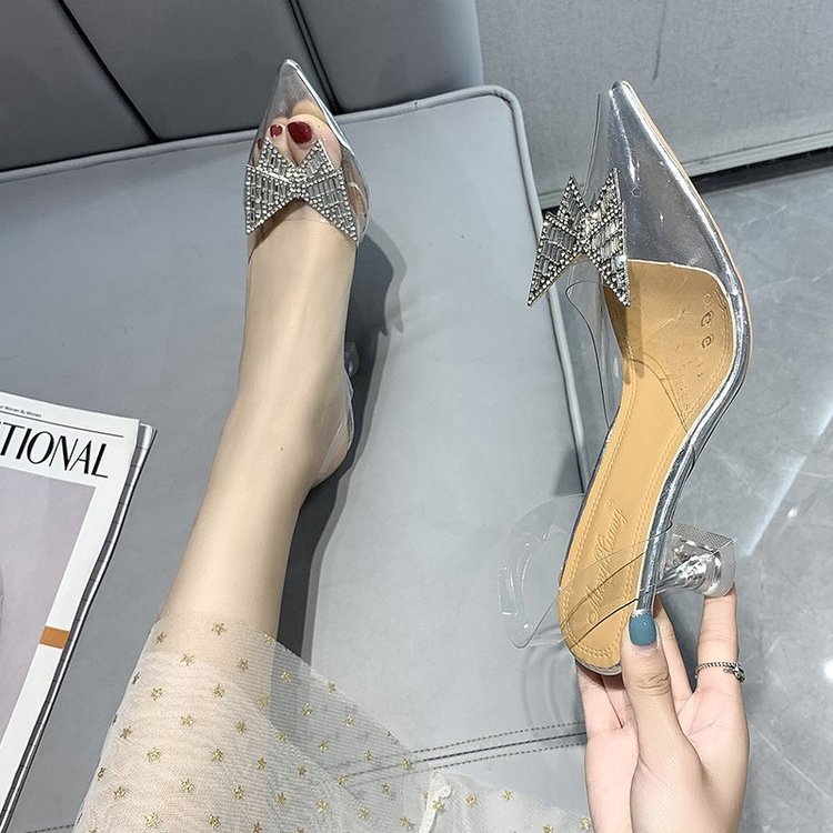 蝴蝶钻扣法式高跟鞋夏季新款仙女风尖头透明水钻半拖鞋凉鞋水晶鞋