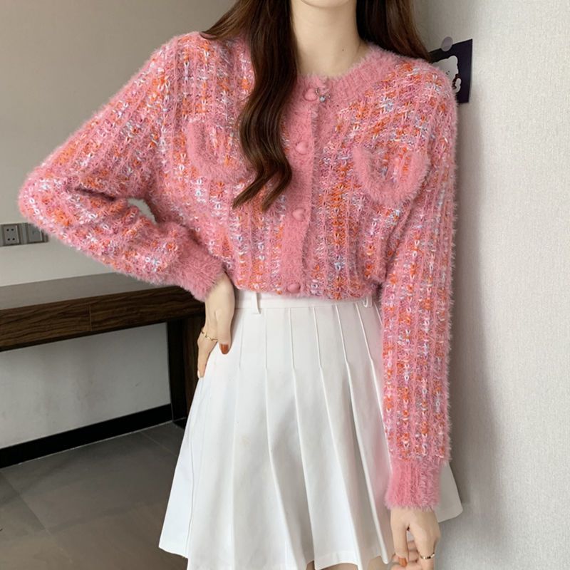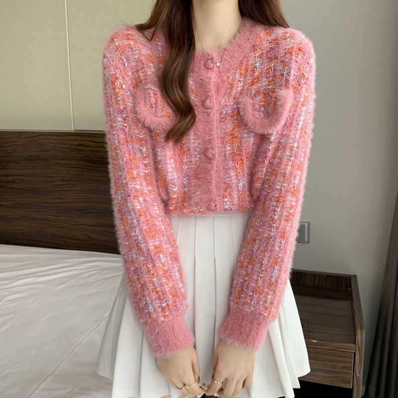 小香风爱心纽扣短款针织开衫女2023春秋季新款法式圆领毛衣外套