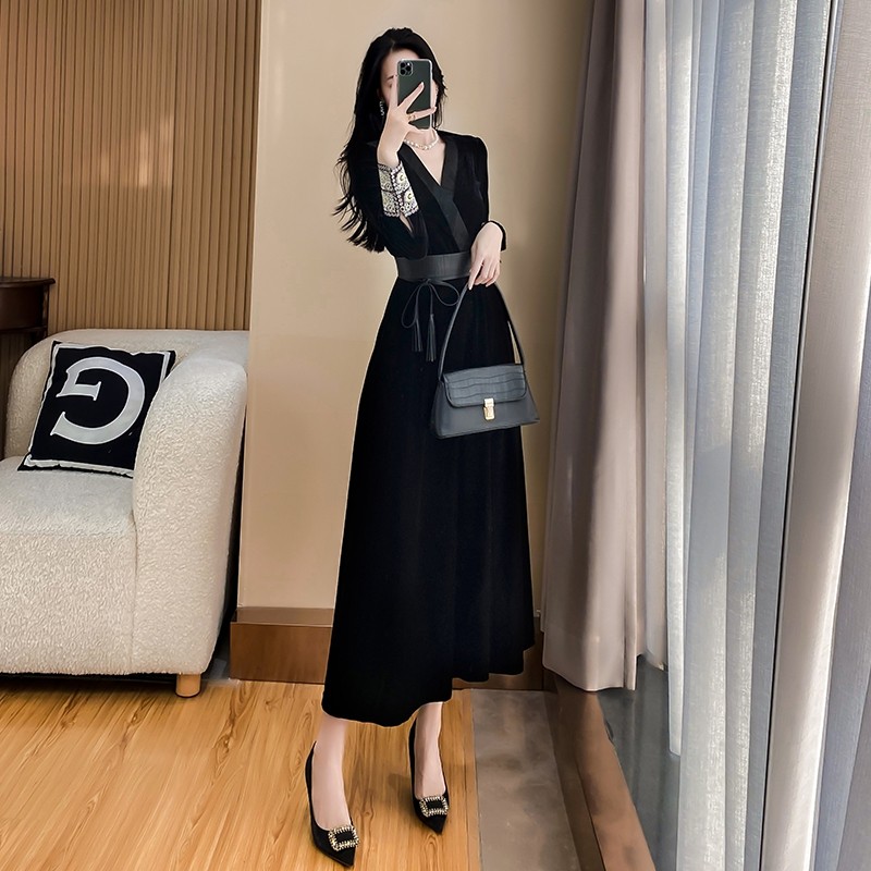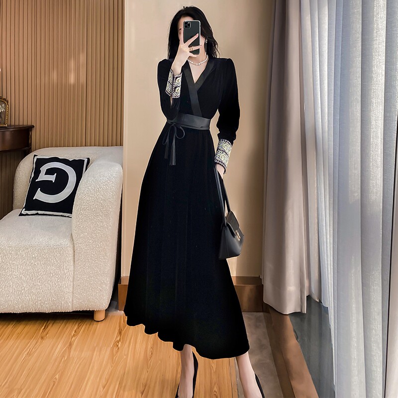 秋装2025年新款女黑色金丝绒连衣裙复古收腰高贵洋气长裙高级感