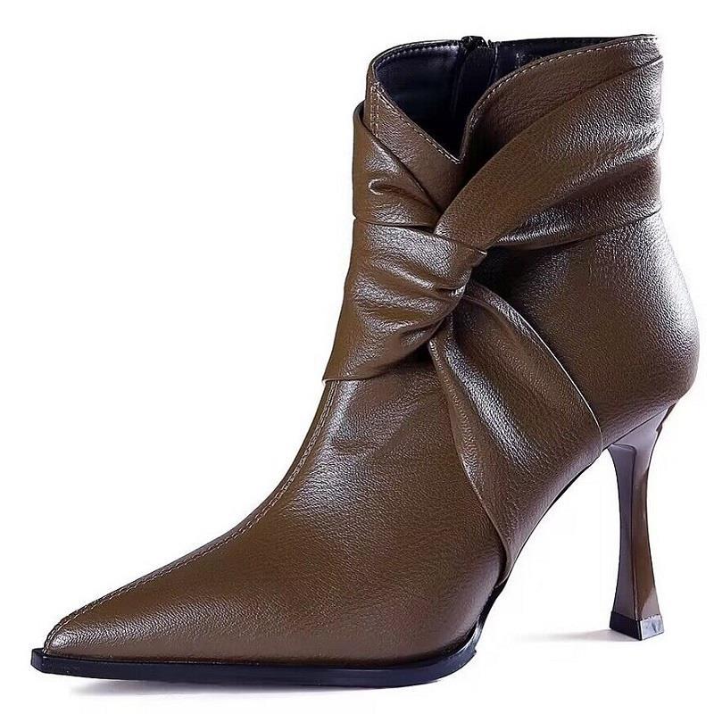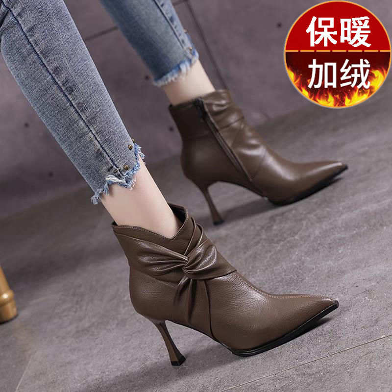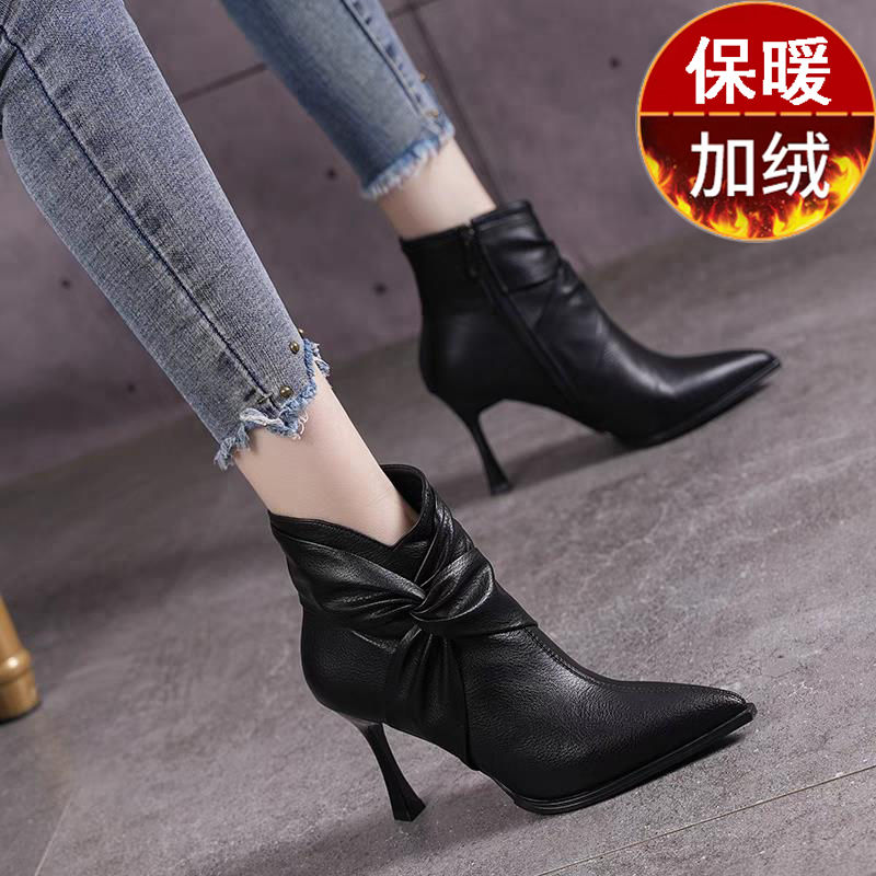 紅啨廷真皮高跟短靴女2025秋冬新款尖头细跟时装靴侧拉链瘦瘦靴女
