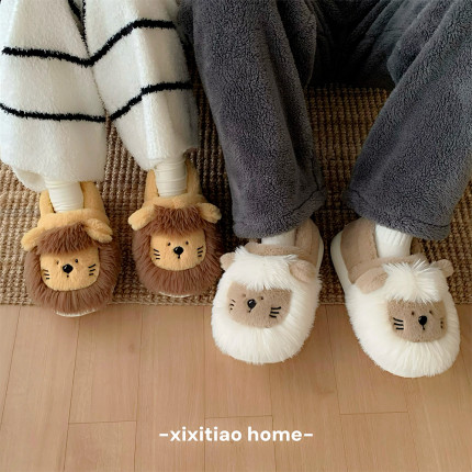 细细条 情侣防滑居家趣味小狮子棉拖鞋冬包跟保暖舒适毛毛鞋男女