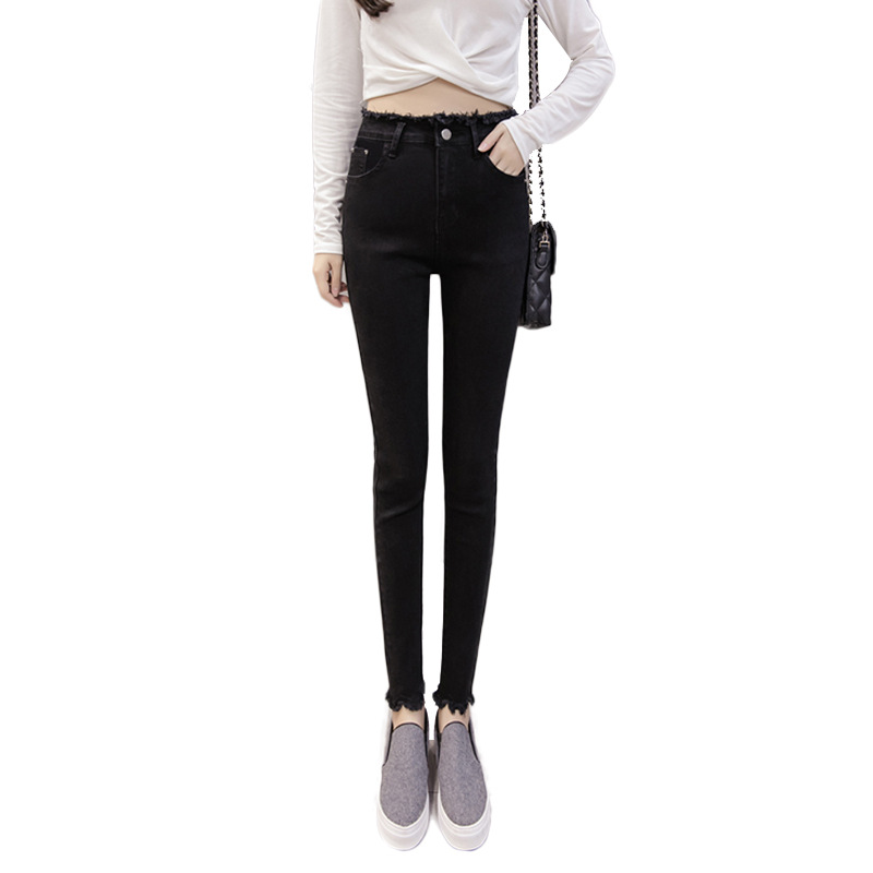 冬季新款韩版高腰修身显高显瘦牛仔裤女学生毛边百搭小脚铅笔