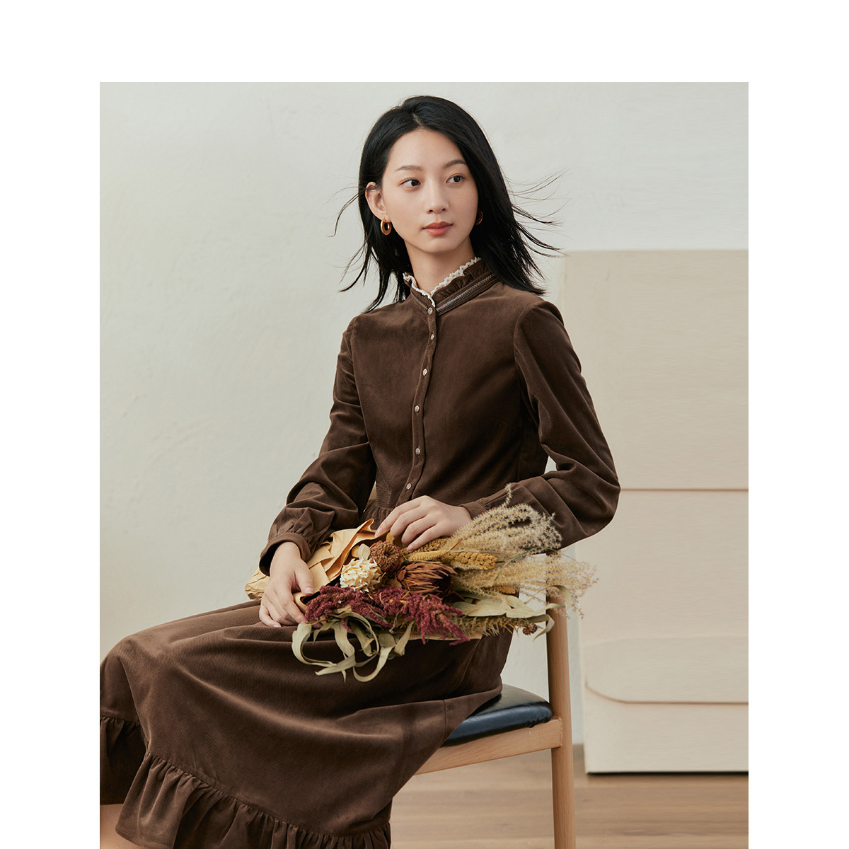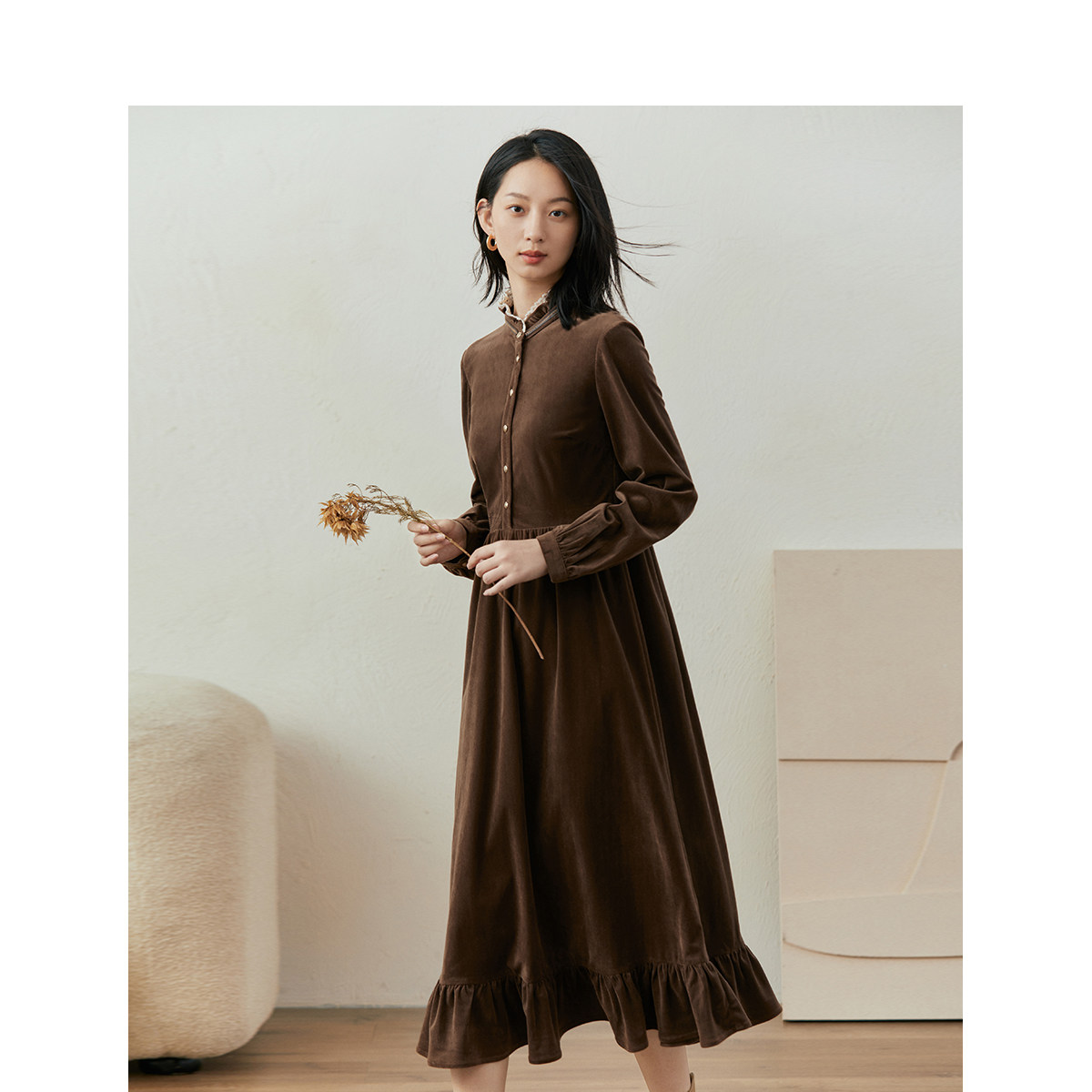 【商场同款】茵曼双层荷叶领连衣裙2023冬季女装新款长袖高腰裙子