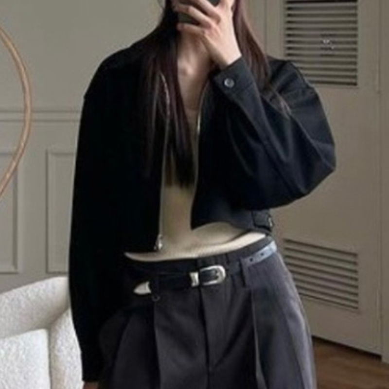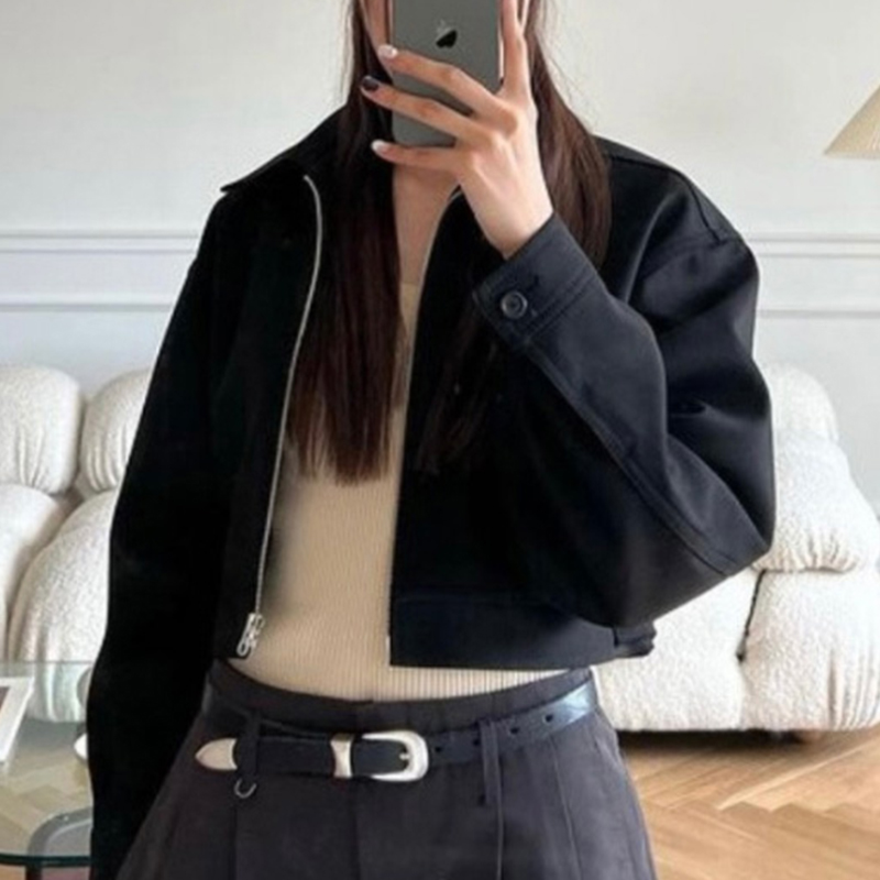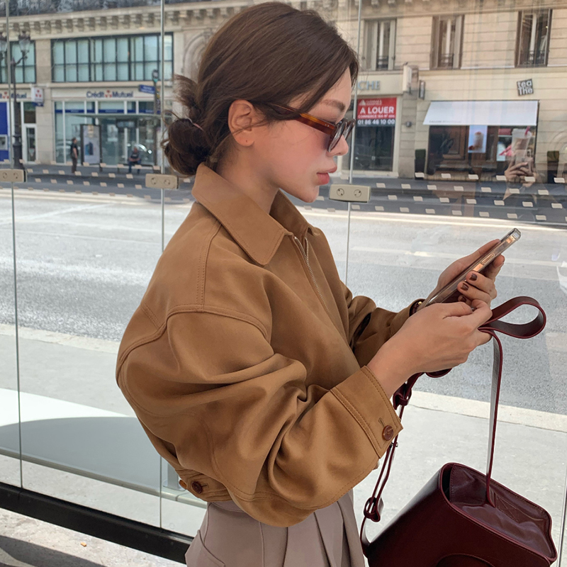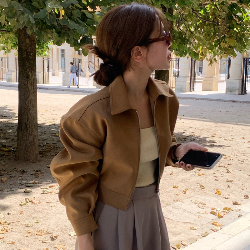 韩国chic秋季复古英伦风翻领拉链设计宽松百搭长袖机车服短款外套