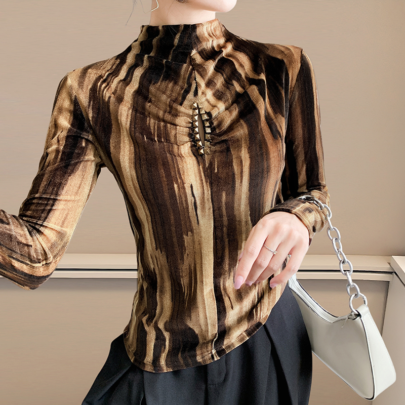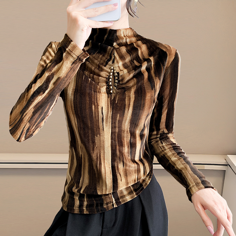 秋冬性感打底衫半高领T恤长袖女印花显瘦镂空钉珠条纹网纱上衣女