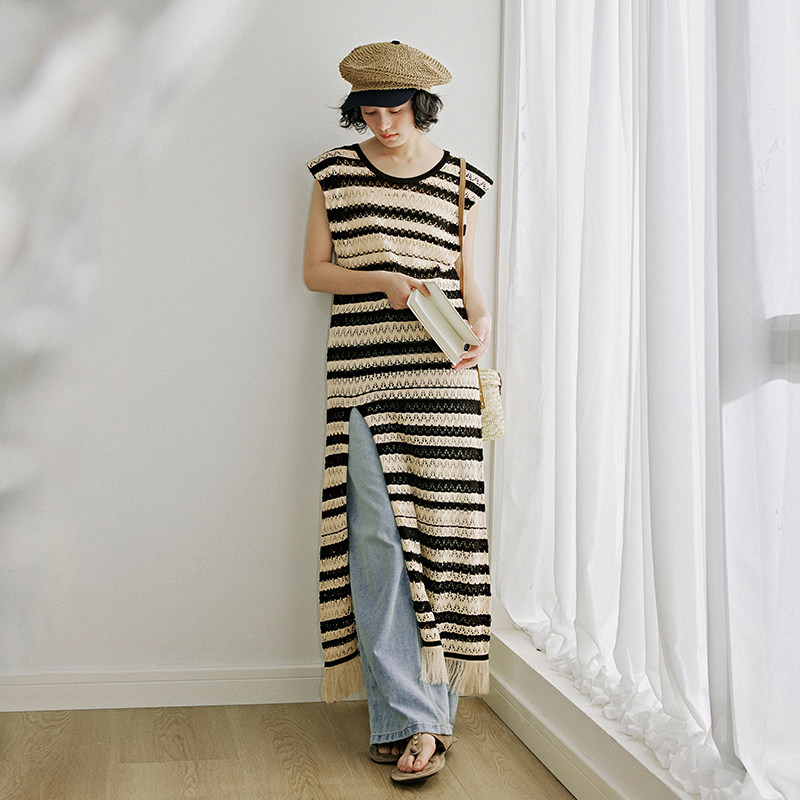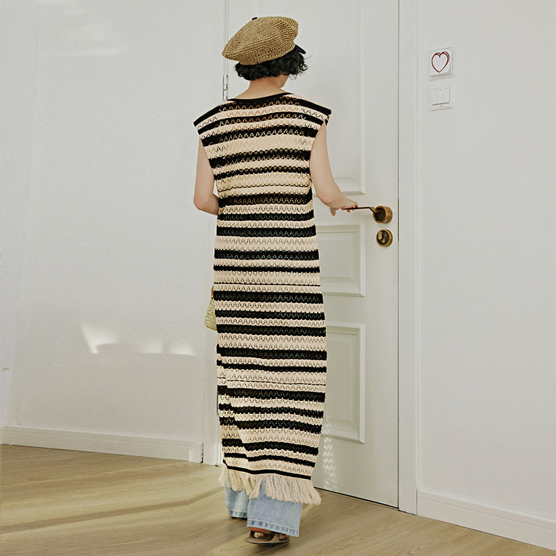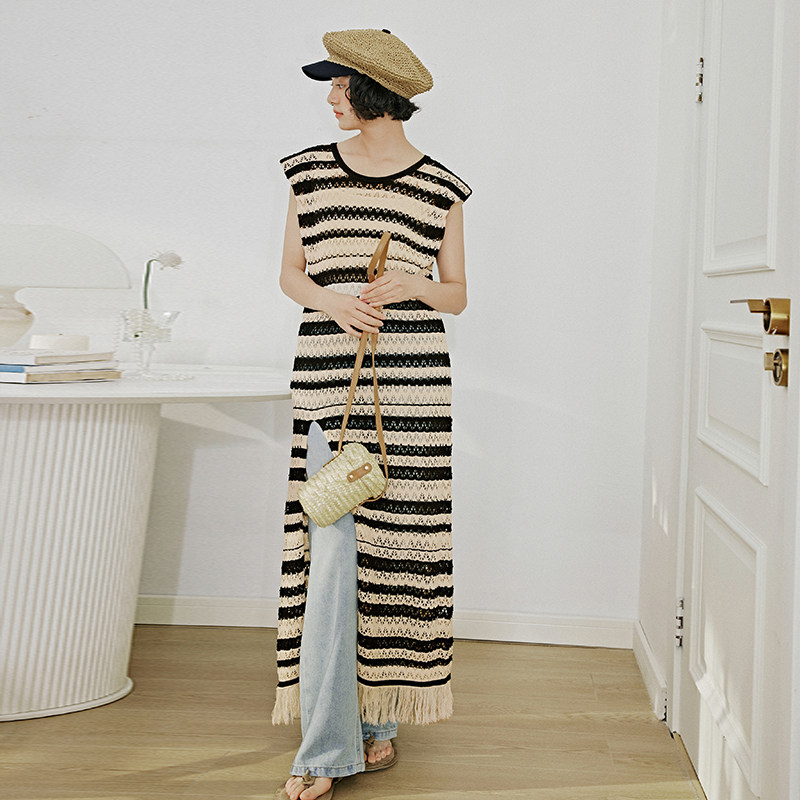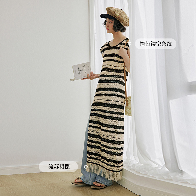 PIT复古法式镂空条纹吊带针织连衣裙女夏季新款渡假沙滩长裙子