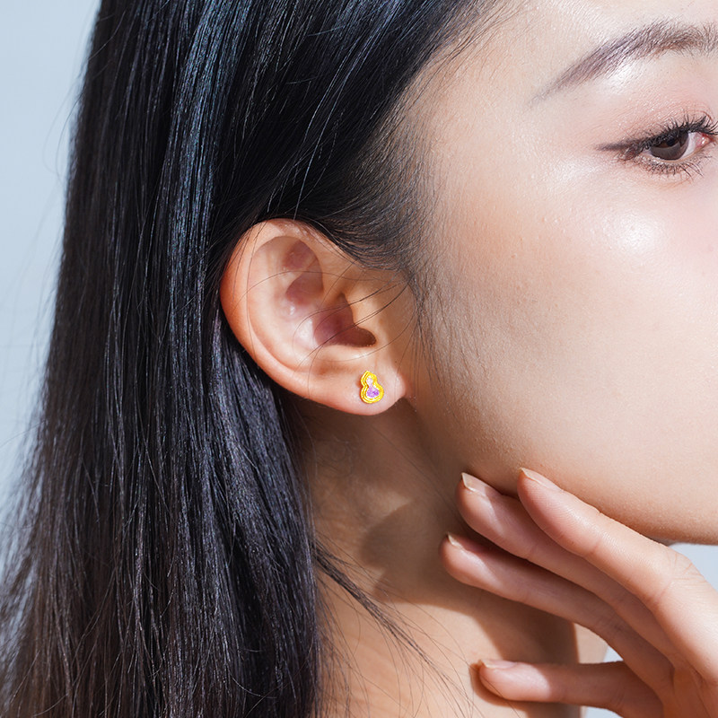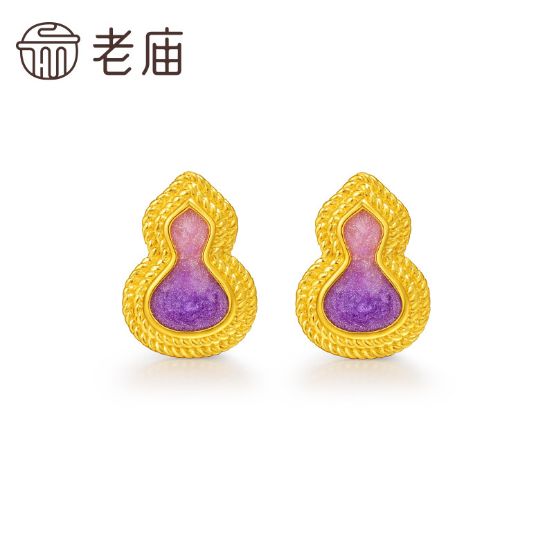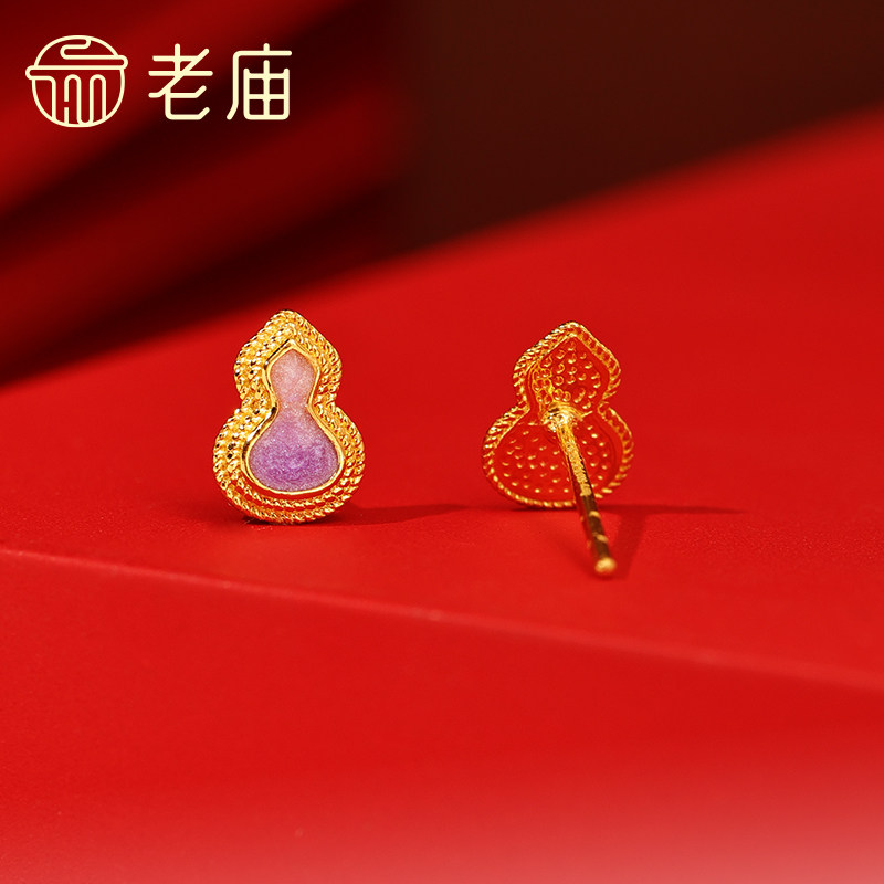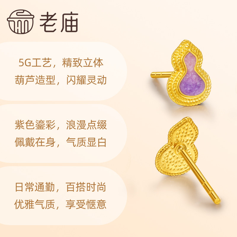 老庙黄金足金999渐变鎏彩葫芦耳钉5G福禄添彩紫气东来闪耀