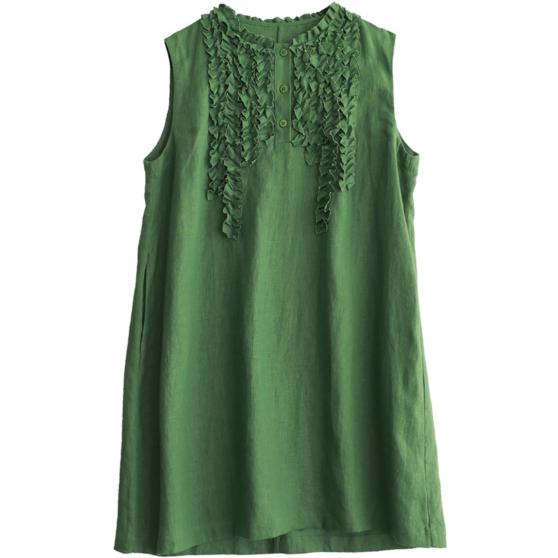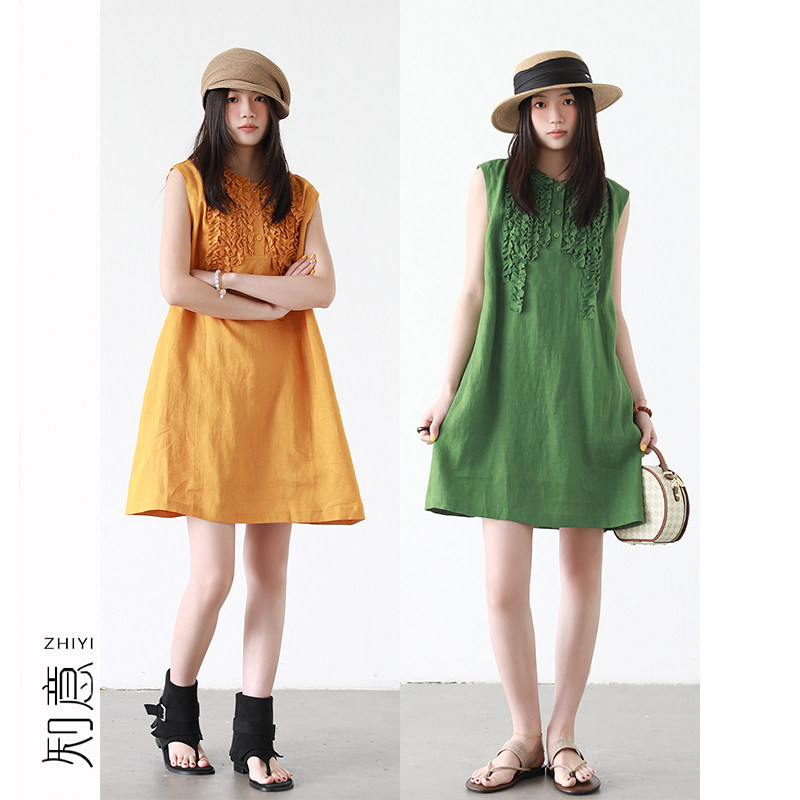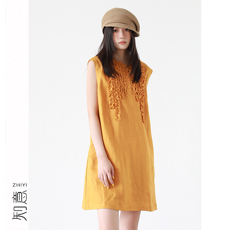 知意大码设计感木耳边100%亚麻连衣裙女夏季高级感无袖中长款裙子
