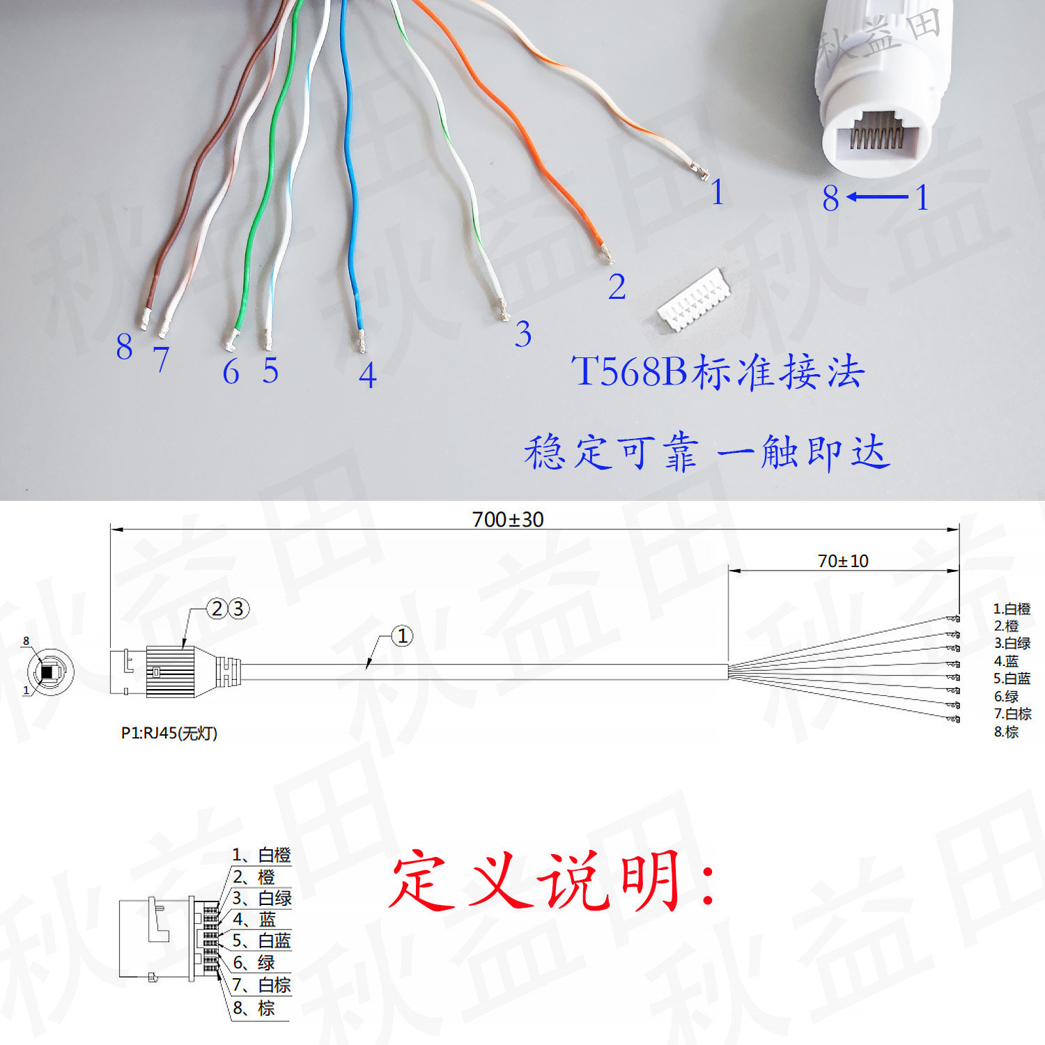 T568B标准8芯单头tp电信萤石海康大华水星宇视中维POE摄像机尾线