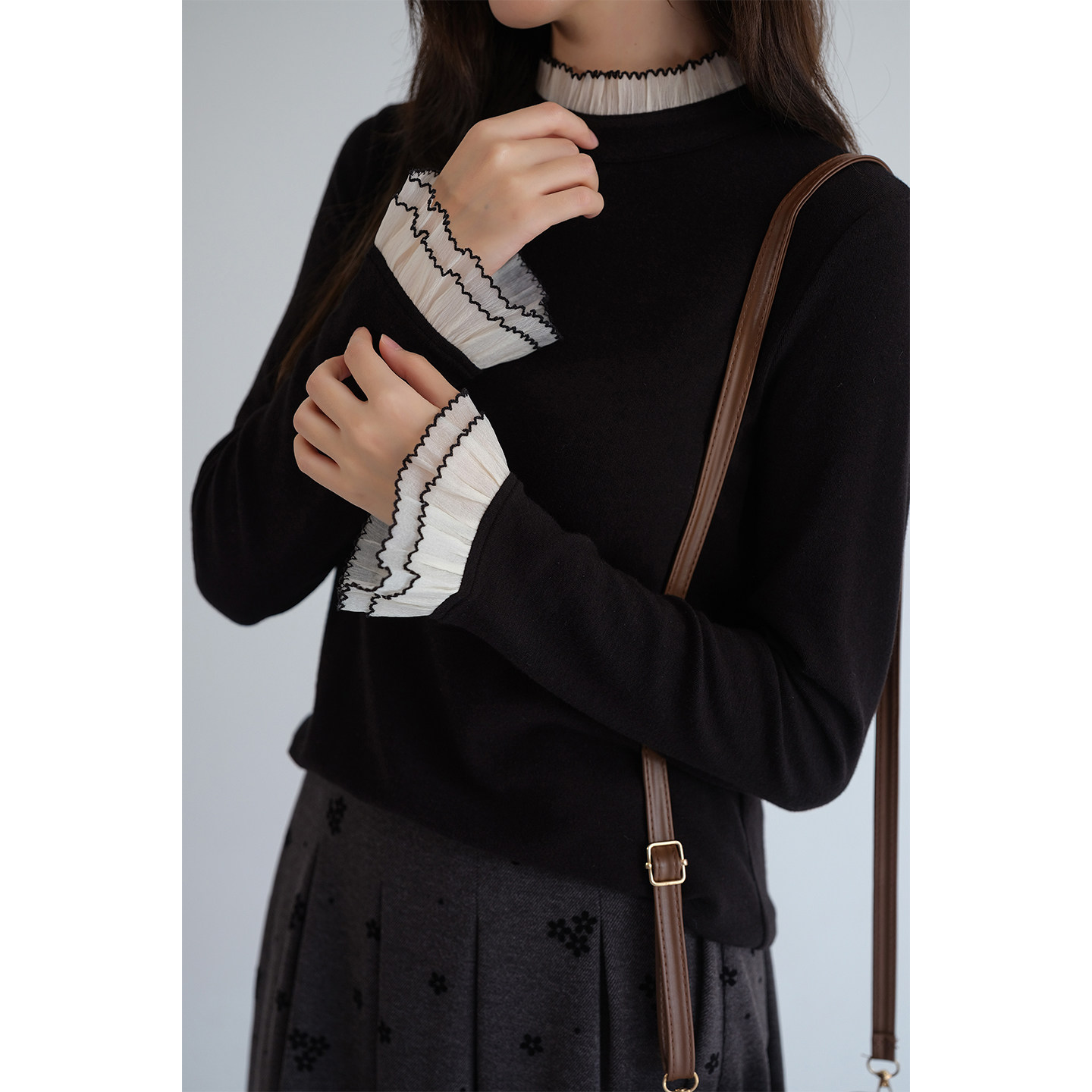 蓝若水大码女装半高领蕾丝针织衫2026春装新款法式韩系喇叭袖上衣