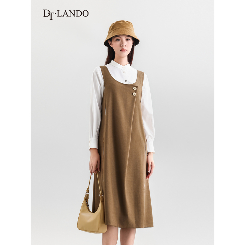 DTLANDO春季新款背带裙女复古文艺纽扣两片U领吊带连衣裙设计感