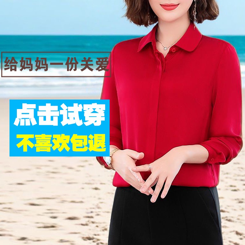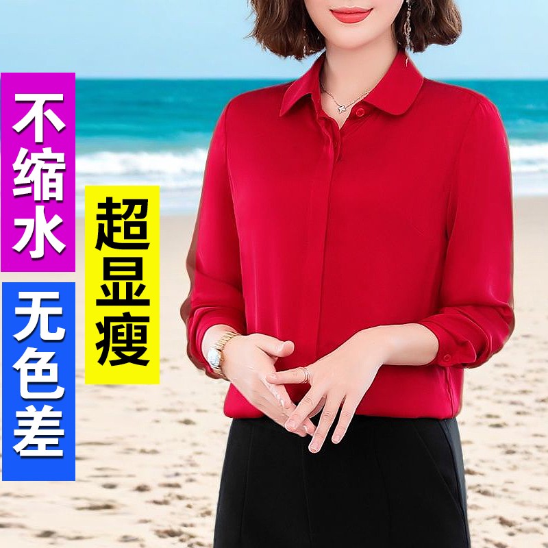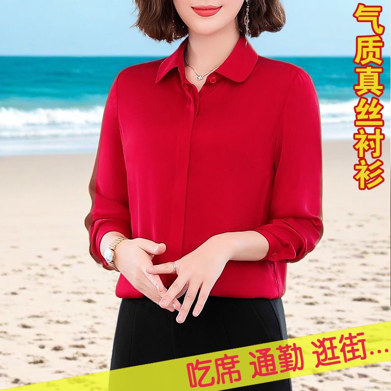重磅高端大牌红色真丝衬衫女长袖小衫2025新款妈妈杭州桑蚕丝上衣