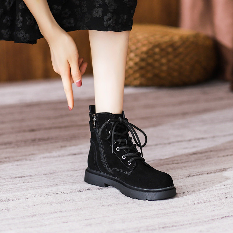 新款马丁靴女2024英伦风磨砂真皮女靴中跟平底短靴女系带真皮靴子