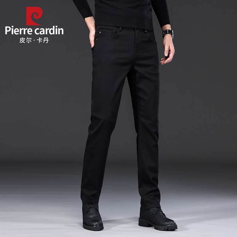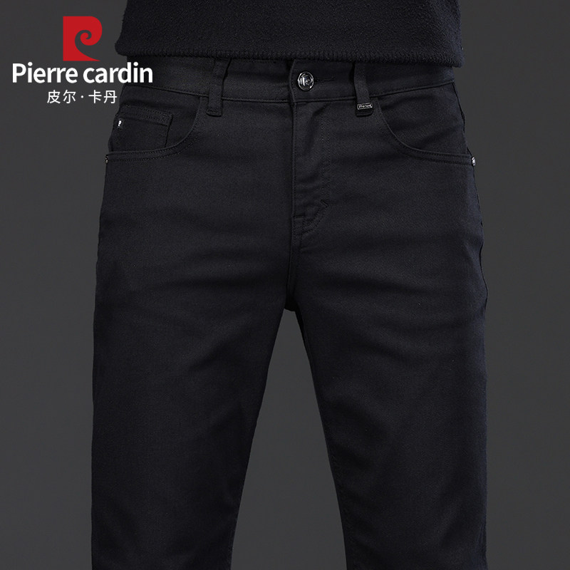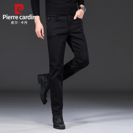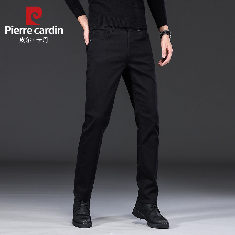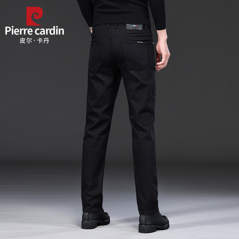 皮尔卡丹男款牛仔裤黑色商务休闲秋直筒高端男士冬加绒加厚裤男
