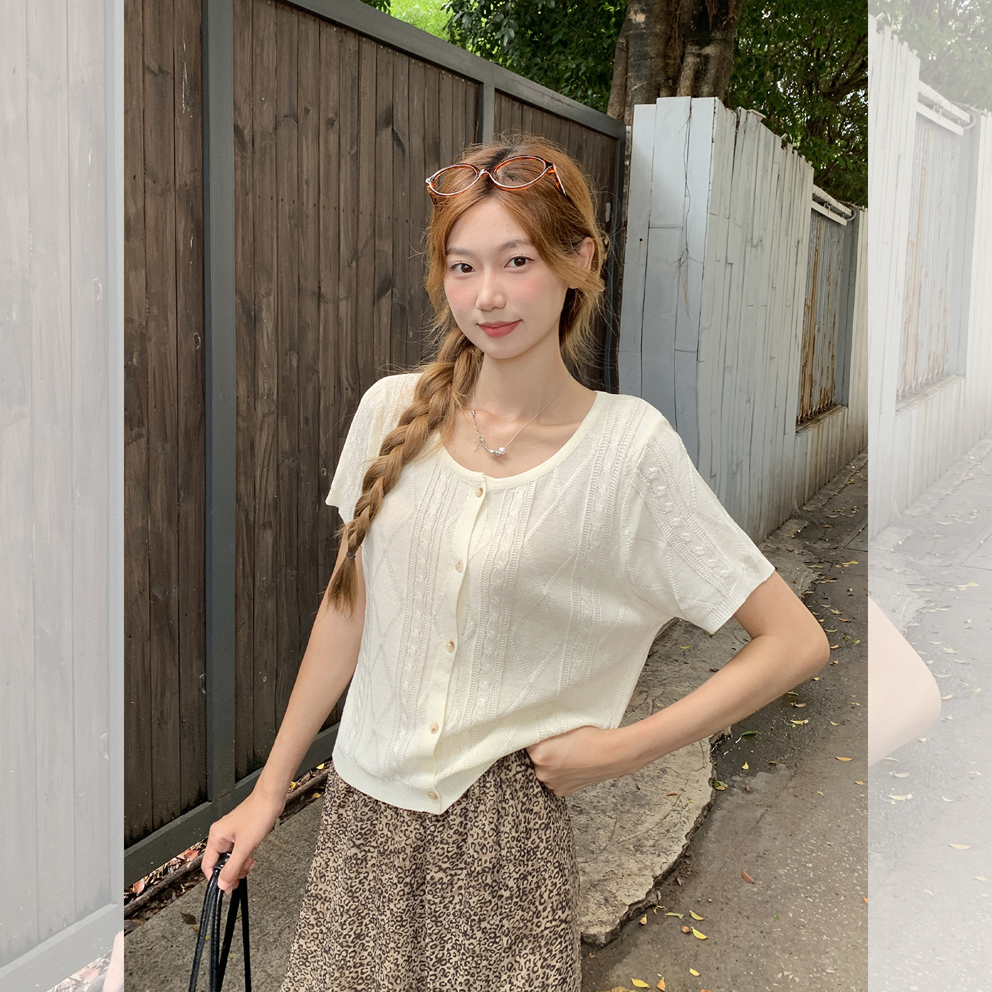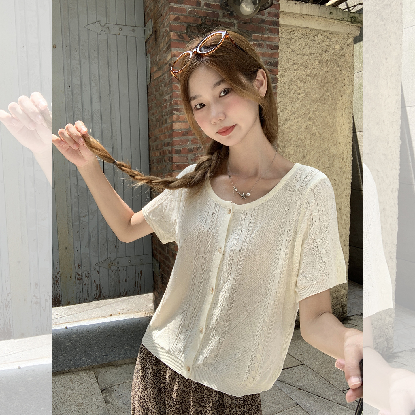 法式气质圆领单排扣针织开衫短袖女2025年新款宽松薄款高级感T恤