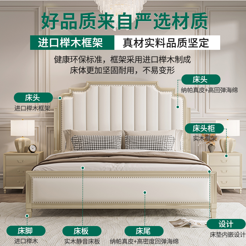 美式主卧轻奢风实木床现代简约纳帕真皮1.8米欧式床家具高箱储物