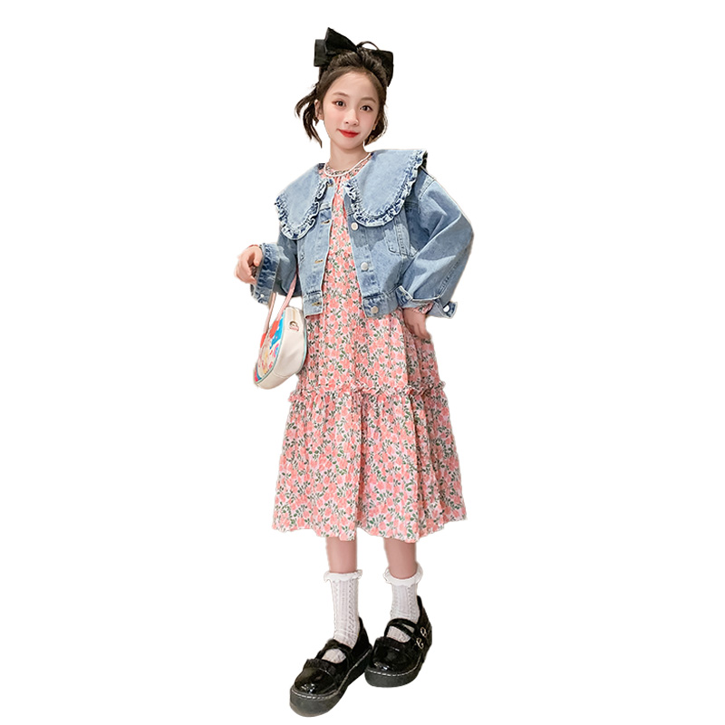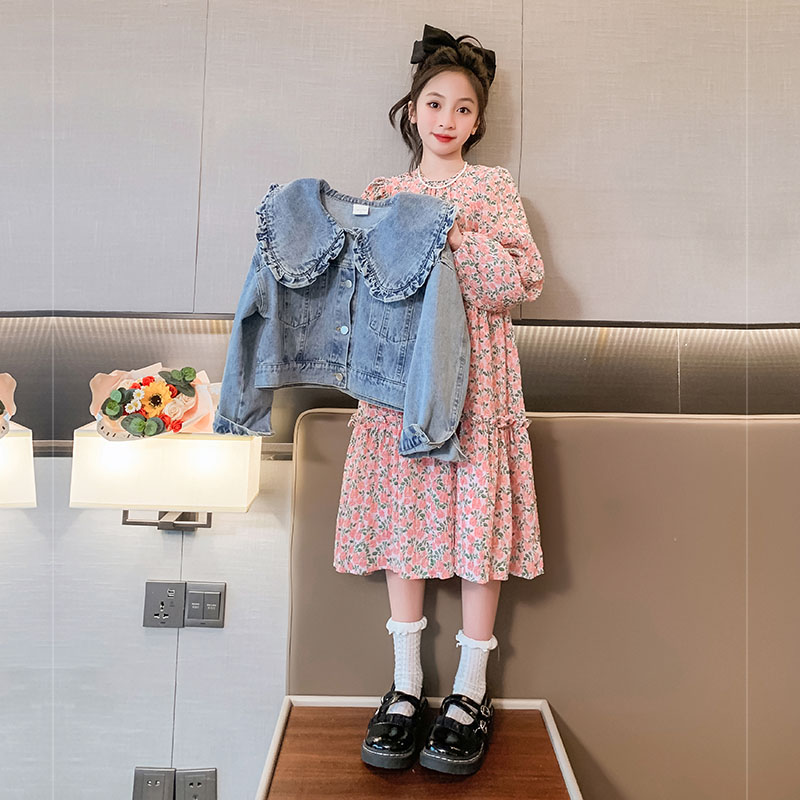 女童连衣裙春秋2023新s款x洋气儿童春装牛仔外套女孩碎花裙套装裙