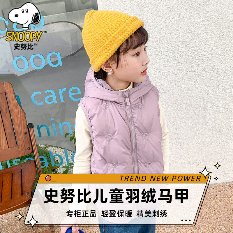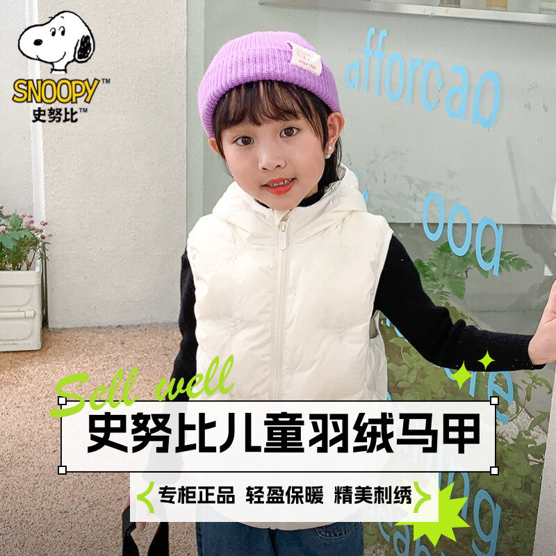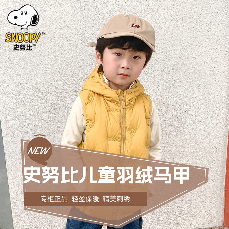 史努比儿童羽绒马甲中大童秋冬男童冬装坎肩女童连帽背心外穿马夹