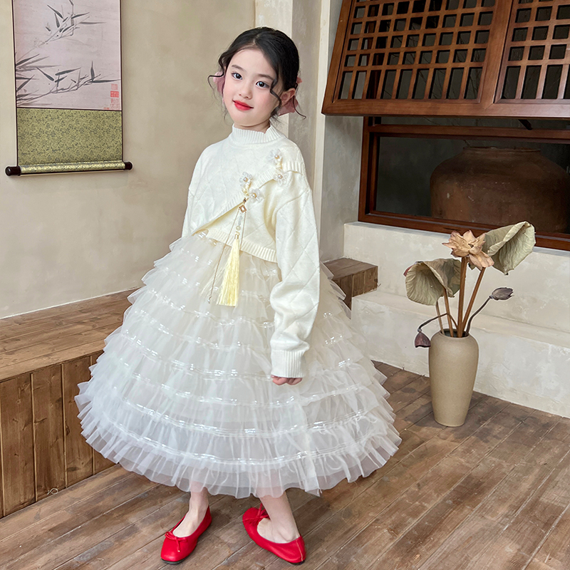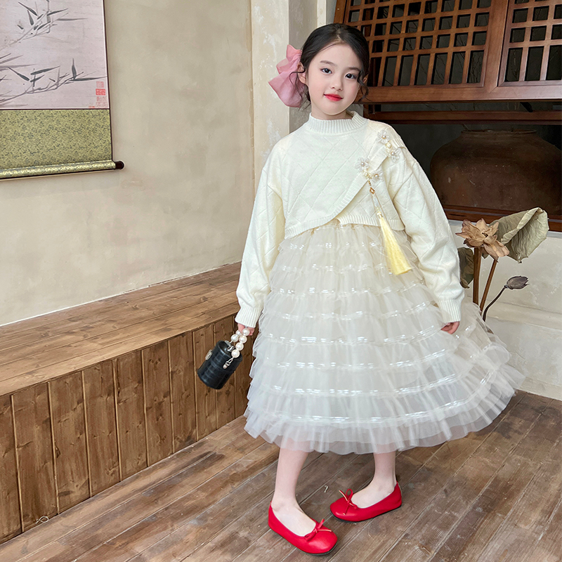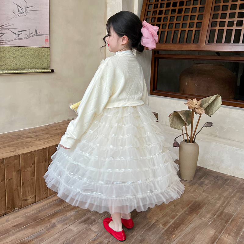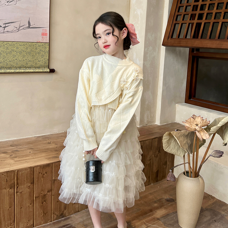栀了成长记女童装小香风套装春秋新款儿童拼接网纱连衣裙针织外套