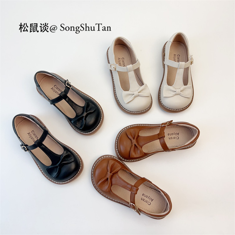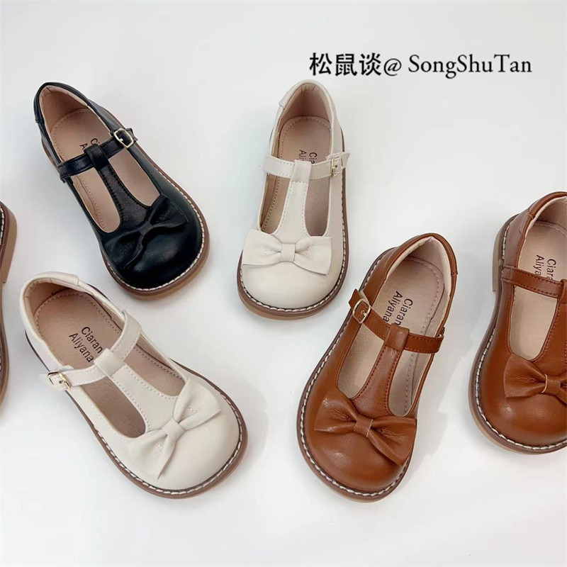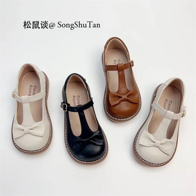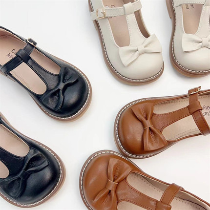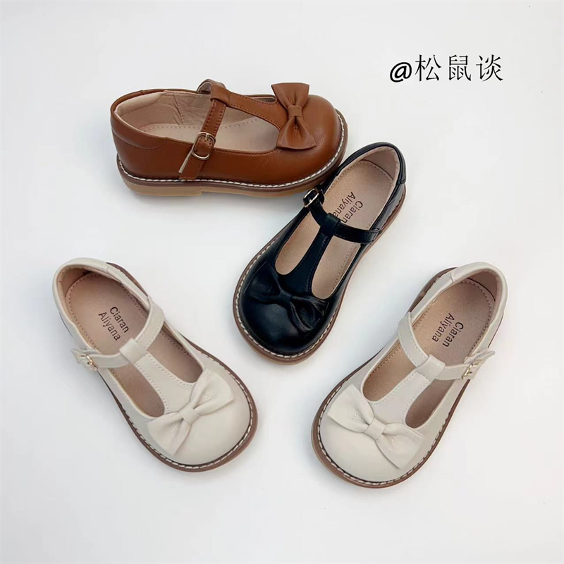真牛皮女童皮鞋蝴蝶结公主鞋黑色演出鞋复古棕色白色礼服单鞋软底