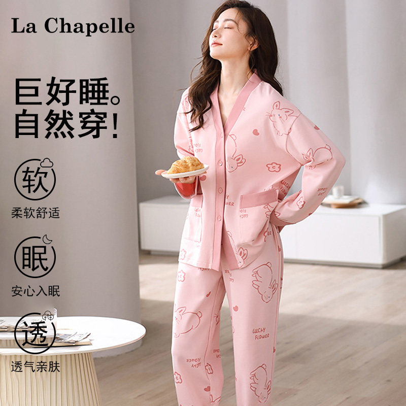 拉夏贝尔睡衣女带胸垫纯棉秋冬长袖长裤V领开衫可外穿家居服套装